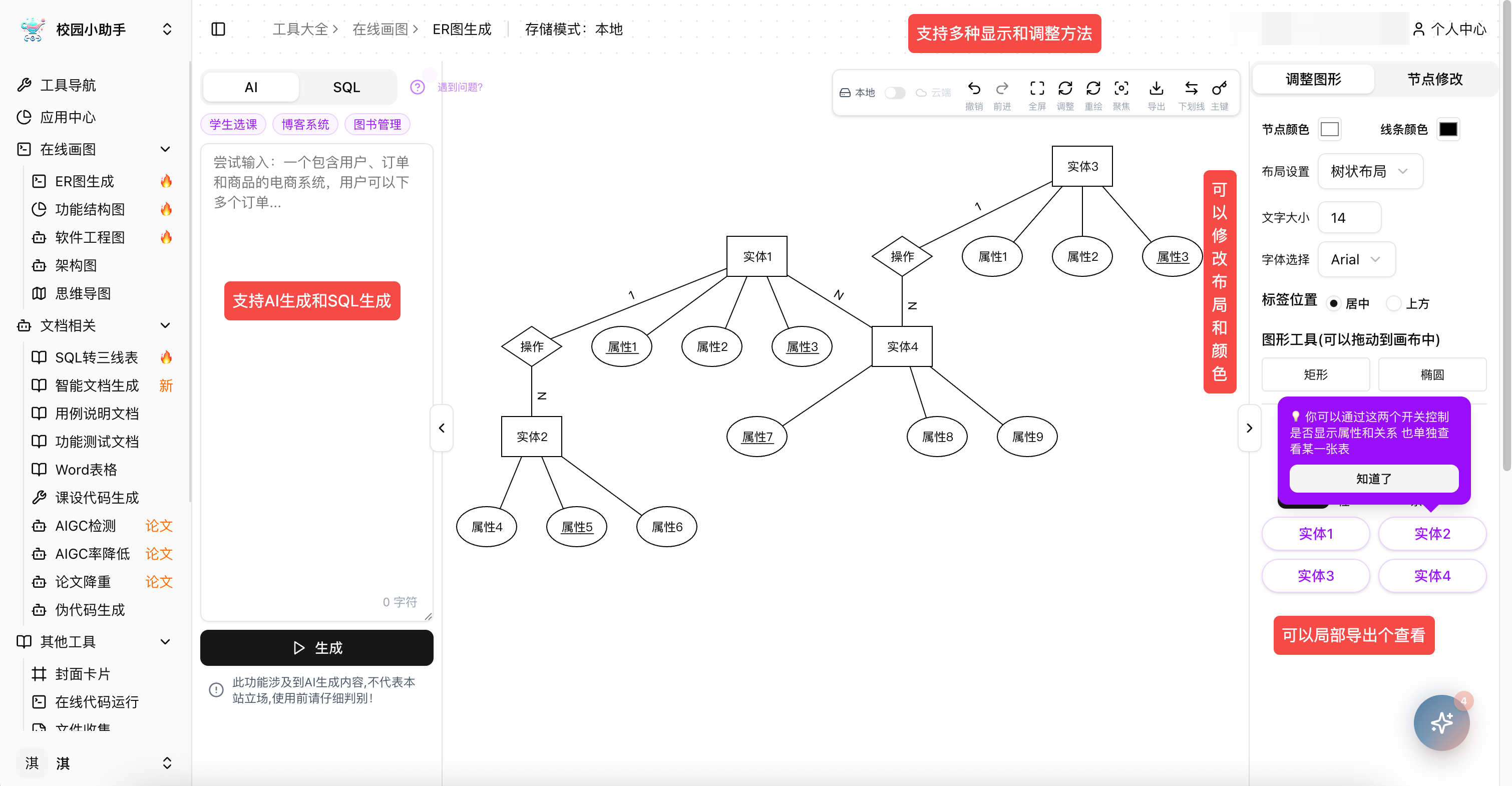 核心亮点:贴合大学生常见场景,内置教务、图书管理、校园电商等常见课设系统的实体库,生成的ER图符合陈氏ER图规范(实体用矩形、属性用椭圆、关系用菱形),适配课程教学和论文要求,生成后可手动调整实体位置、属性细节,兼顾灵活性和规范性。