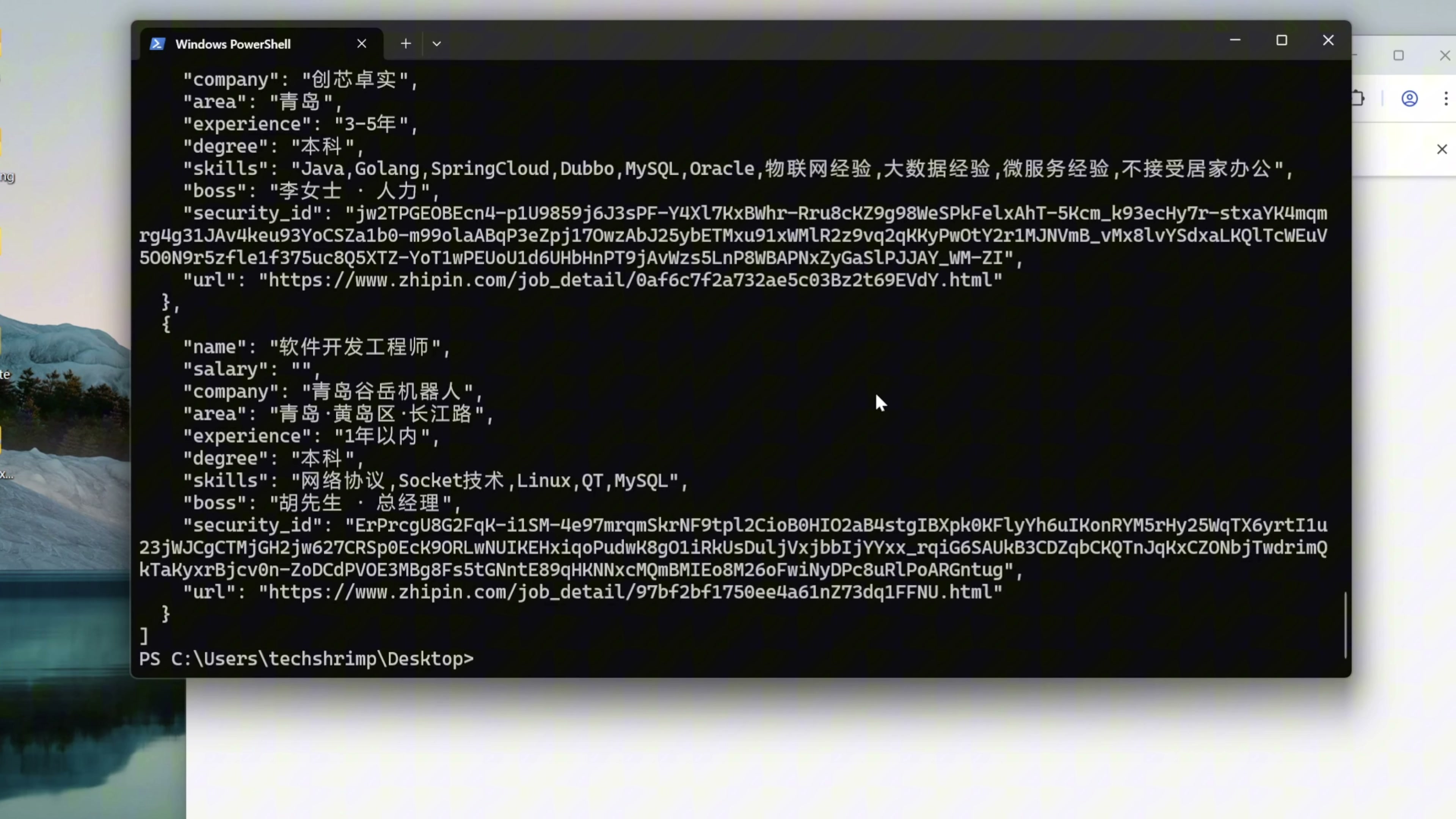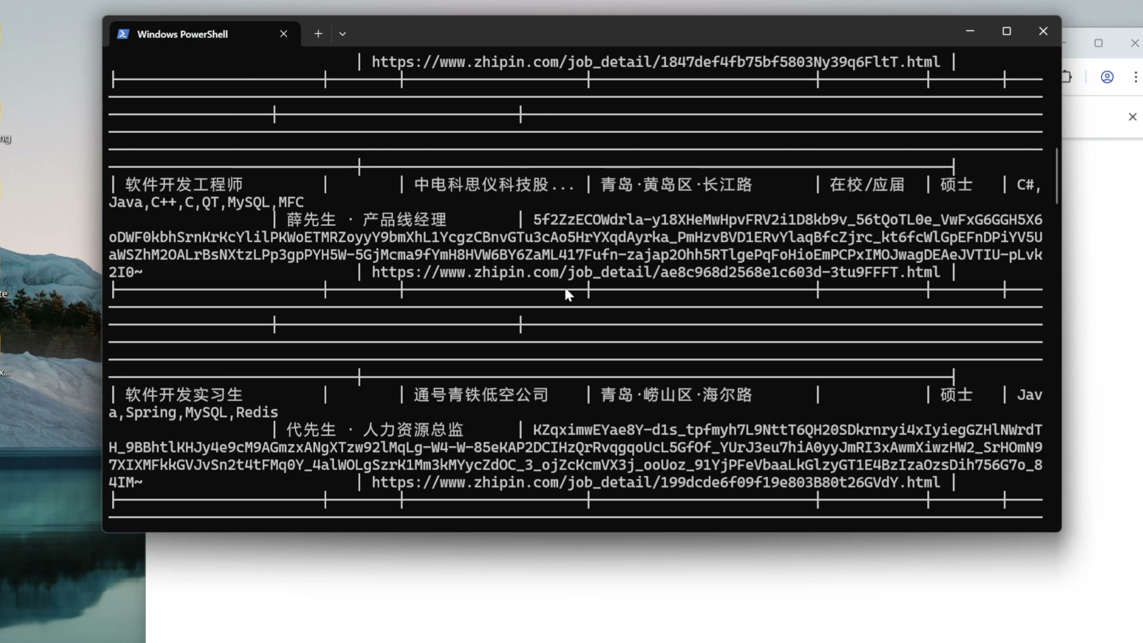 比如我搜索一个青岛的软件开发岗位,我们看到它在后台自动调用了Chrome浏览器,为我们找到了软件开发的相关岗位。
