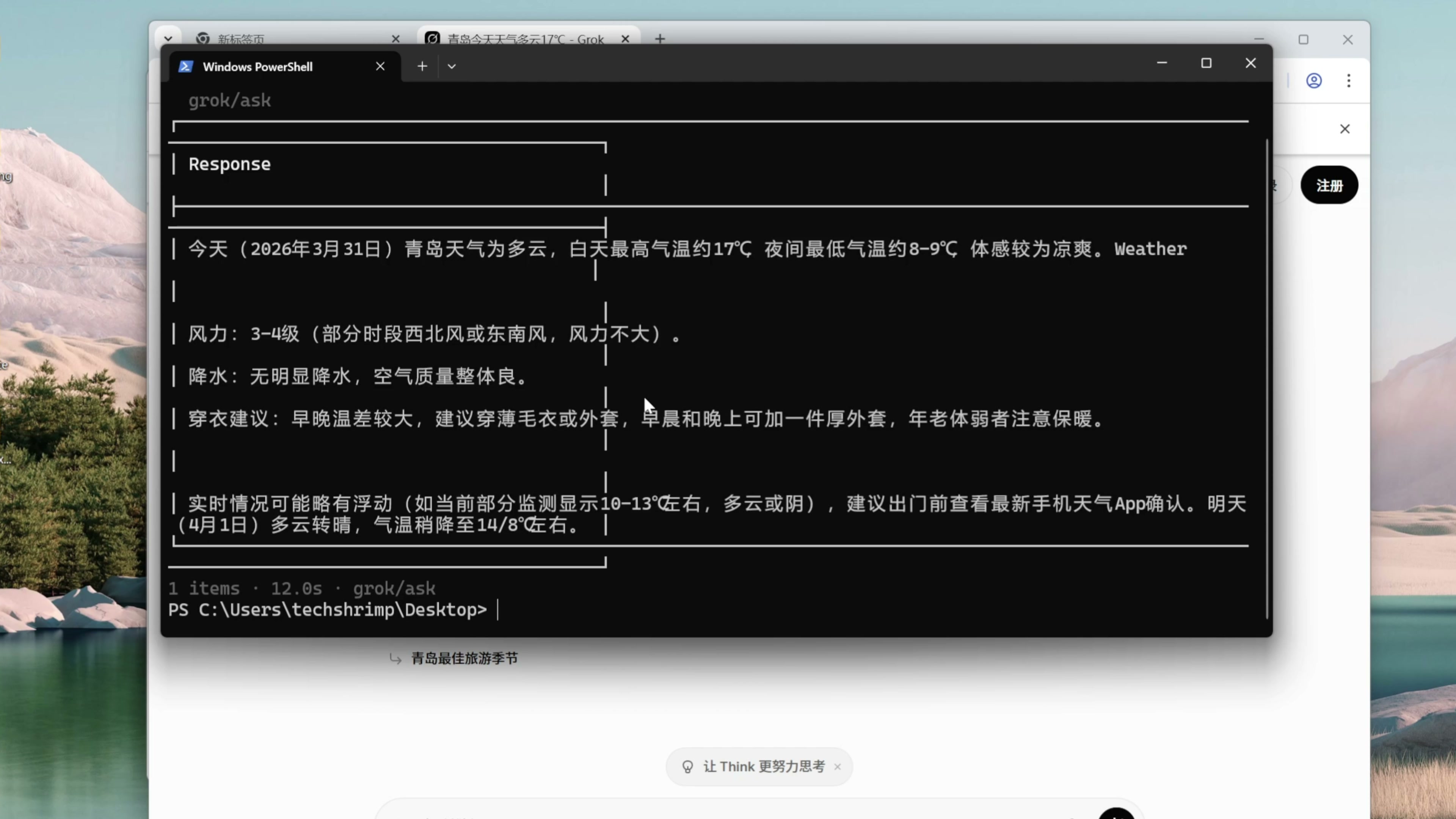 我们也可以输入这个命令 opencli grok ask,询问它一个问题。我们看到OpenCLI会自动操作我的Chrome浏览器,打开Grok的官网,然后来询问它这个问题,拿到结果以后,它可以把结果展示到控制台里面。