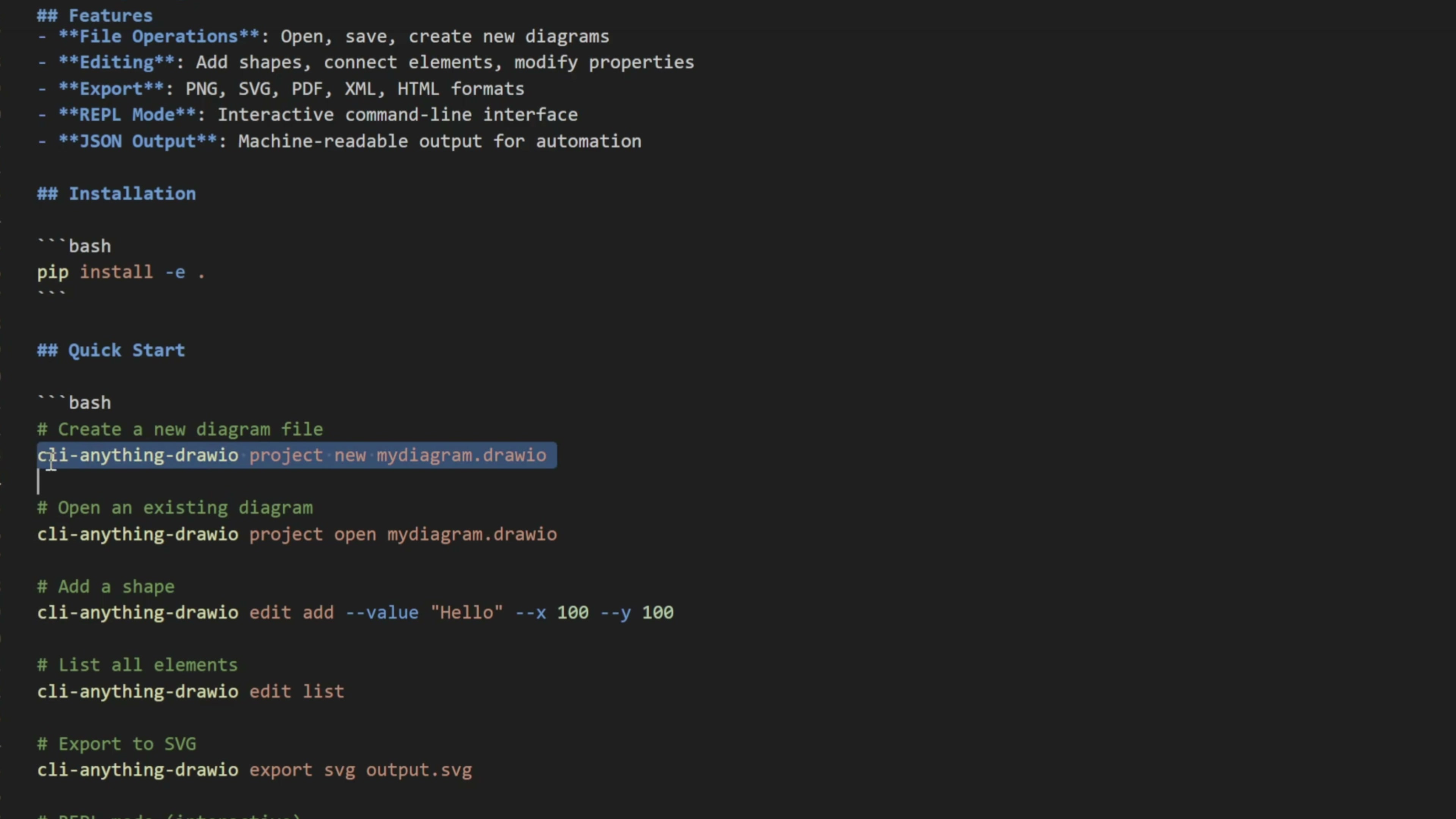 我们来看一下CLI Anything交付的文件。首先是一个说明文件README.md,里面写明了生成的命令行工具是怎么使用的。 drawio_SOP.md,HARNESS.md, TEST.md 三个文件是编写代码时的规范和约束,帮助AI更好的来编写代码。