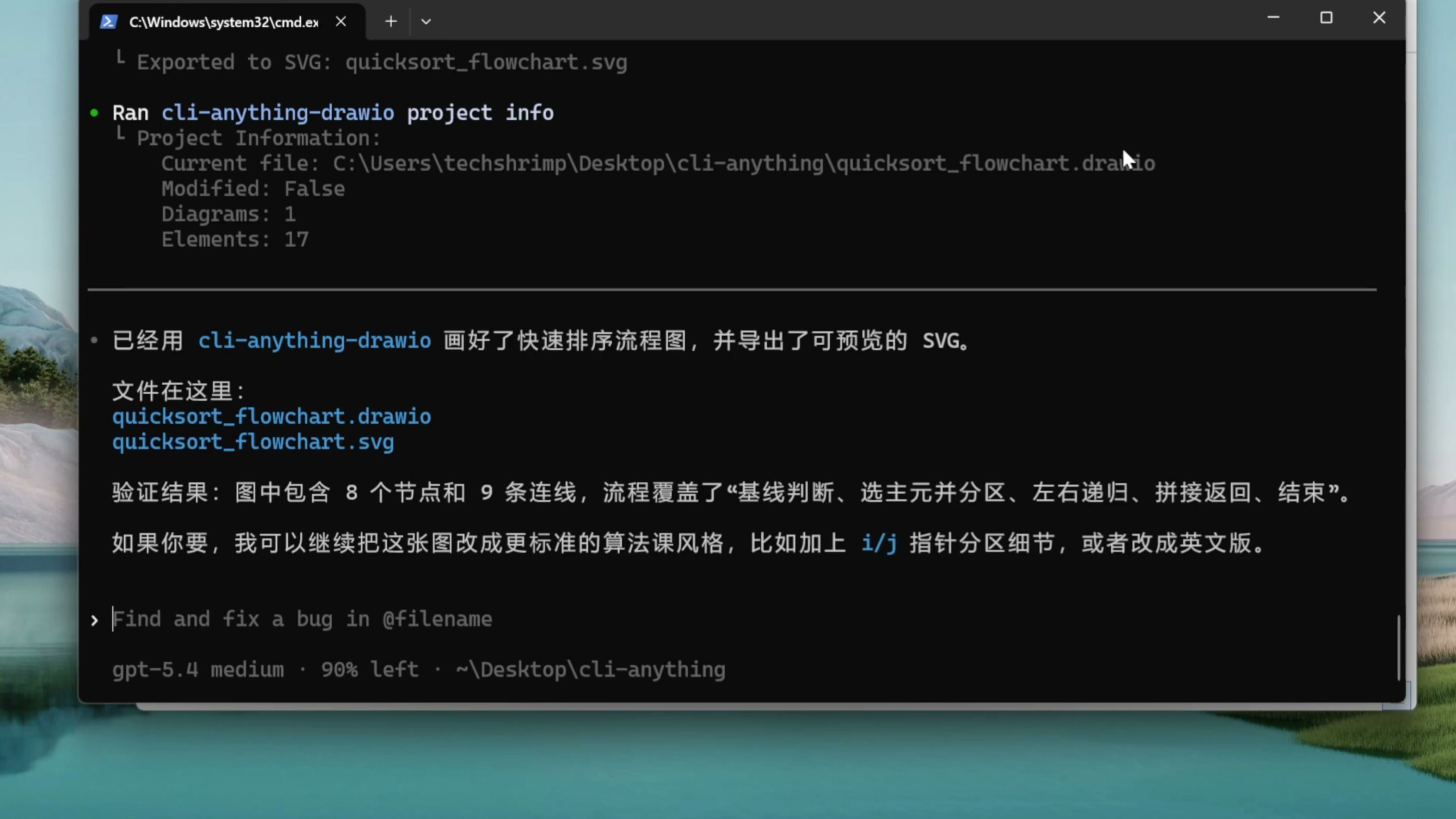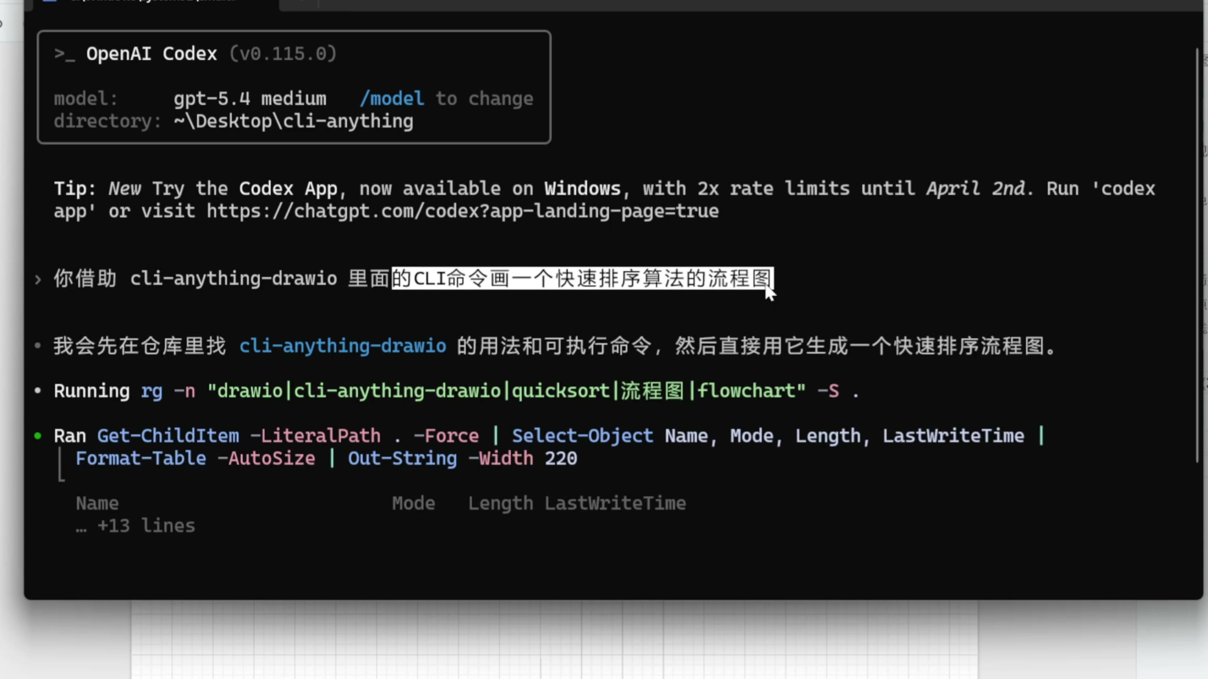 这样我们就把一个需要复杂UI操作的软件,变成了一个AI可以轻易使用的命令行工具。接下来我们就可以让AI借助这些工具来绘制出更加复杂的图形。这里我以Codex为例进行演示,我让AI借助CLI命令画一个快速排序算法的流程图。