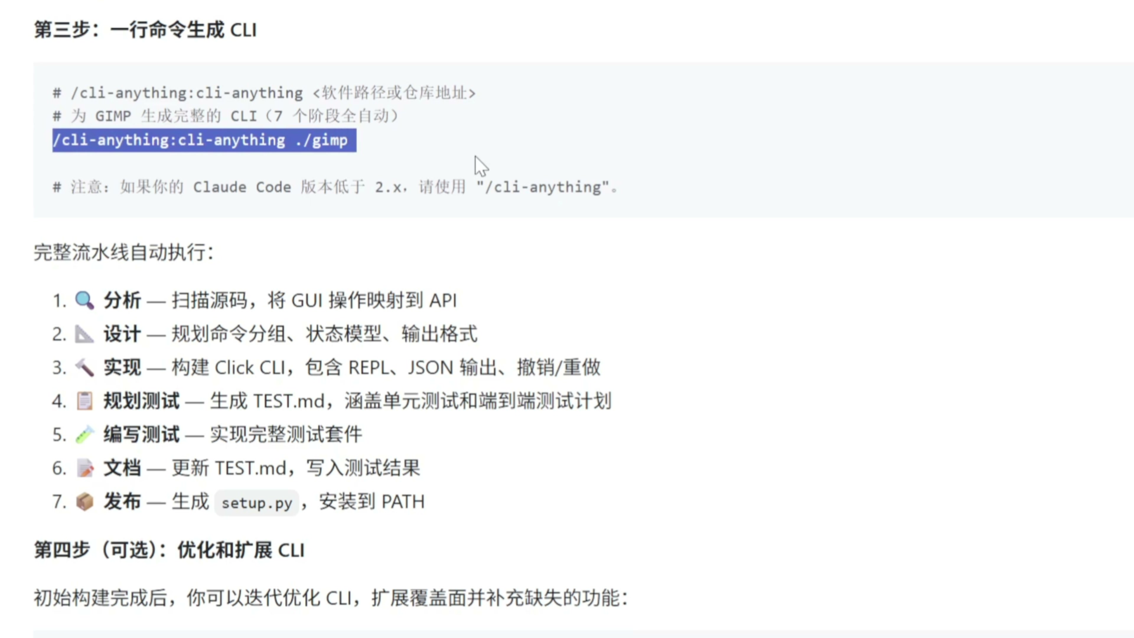 CLI anything,它的愿景是让所有的软件都能被Agent驱动,一行命令就能把任意的开源软件CLI化,并且轻松接入各种Agent框架。我们来看一下它的工作原理:当我们执行这个命令的时候,会启动一个7个步骤的自动化流程。