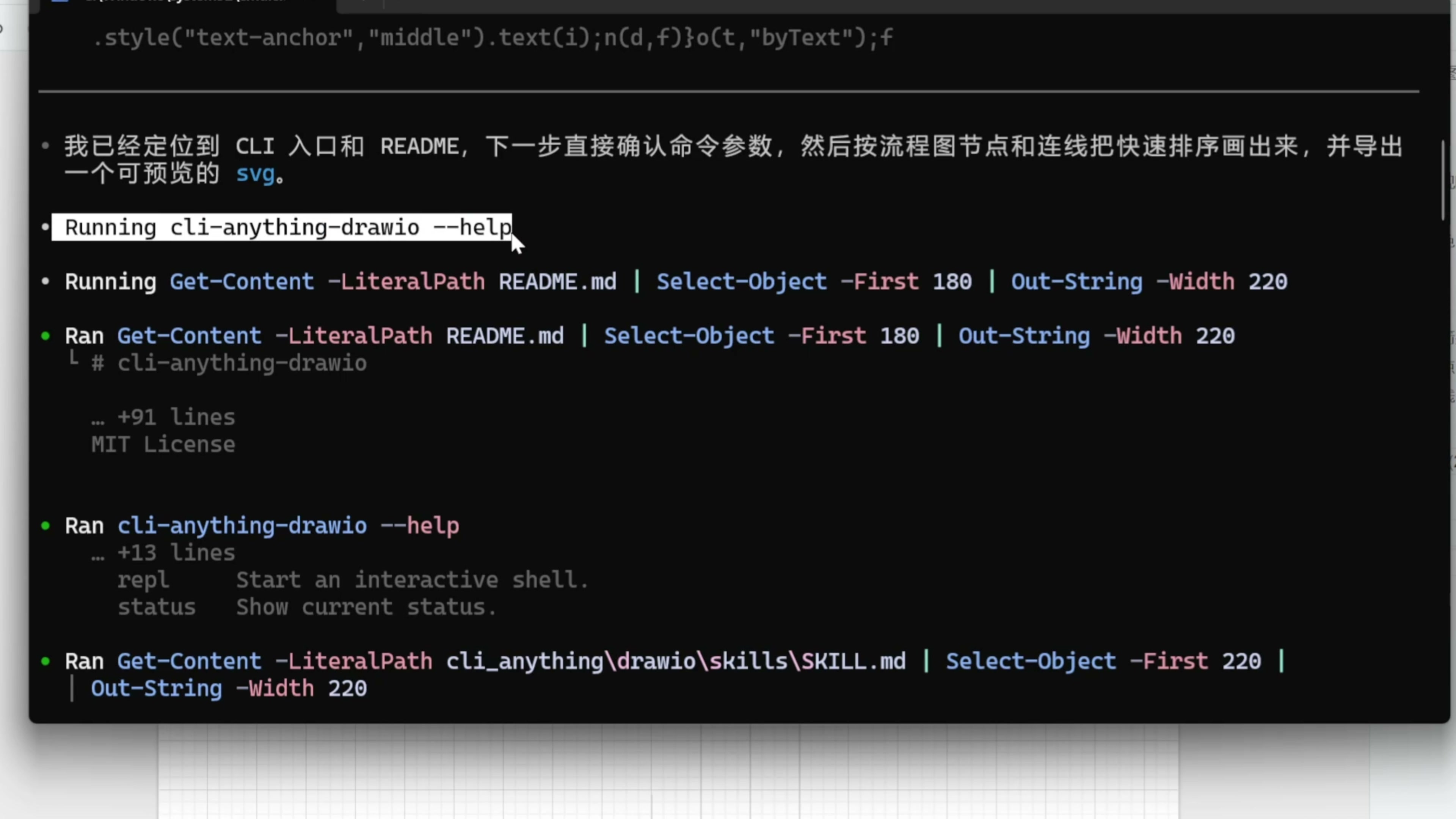 学会了如何使用命令行以后,AI开始调用这些CLI为我们绘制图形。Codex为我们生成了一个drawio格式的源文件,还有一个可以预览的SVG格式图片。