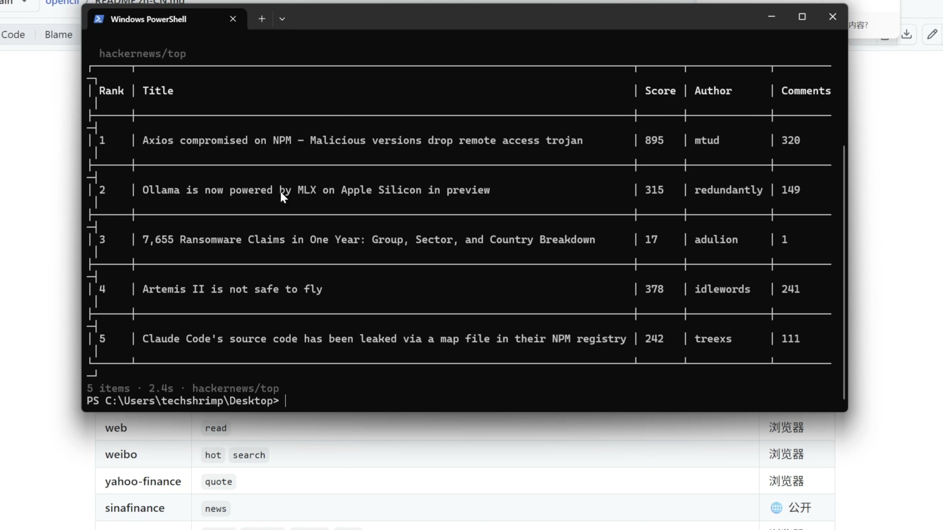 我们来测试一下,比如我们可以执行 opencli hackernews top --limit 5 查询hacker news上面前5个热门话题,这里给出了结果就运行成功了。