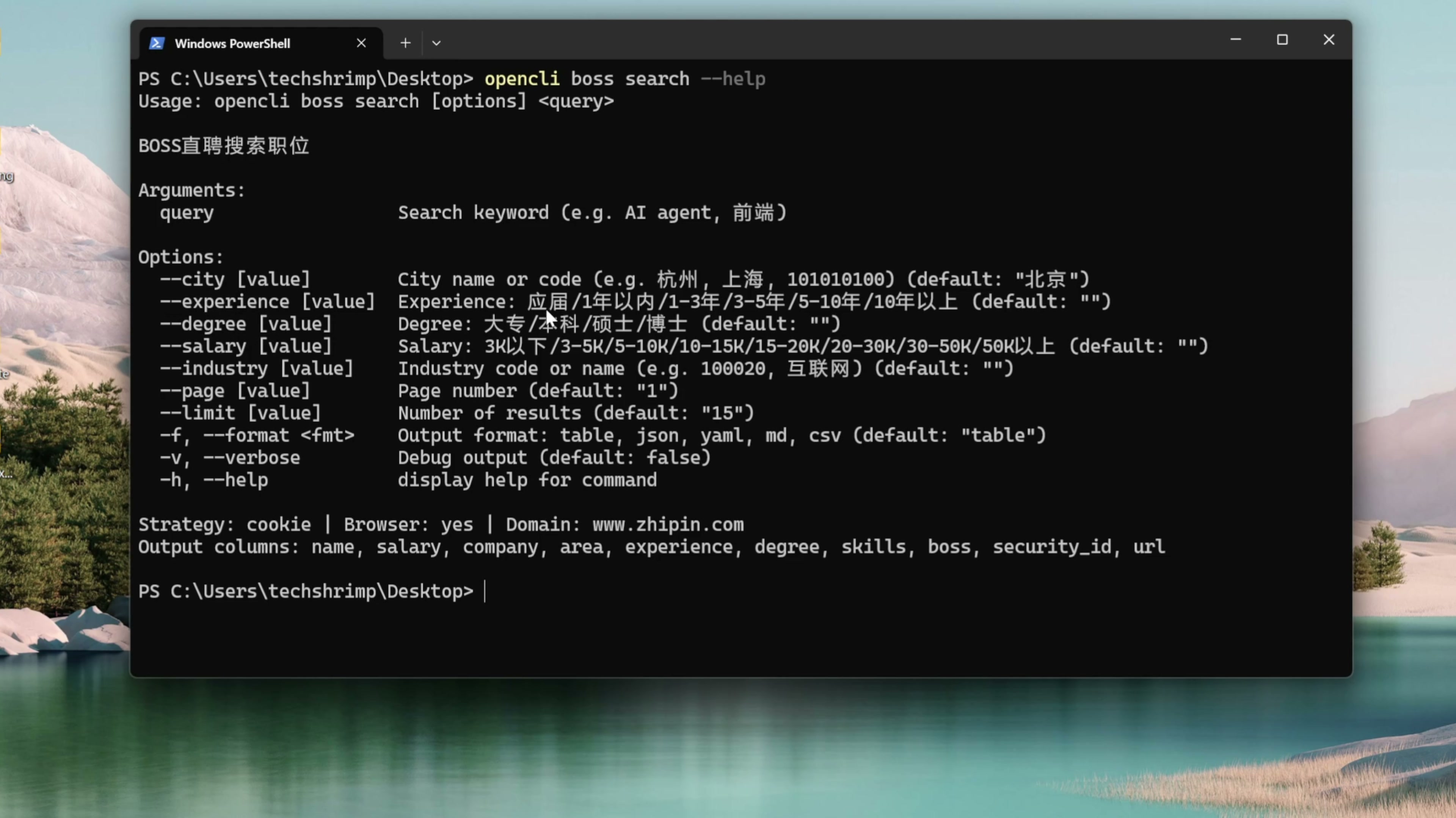 我们再看一个例子,可以使用OpenCLI去boss上面搜索职位。我们先使用opencli boss search --help看一下它支持哪些参数,这里有城市、经验、学历等等。