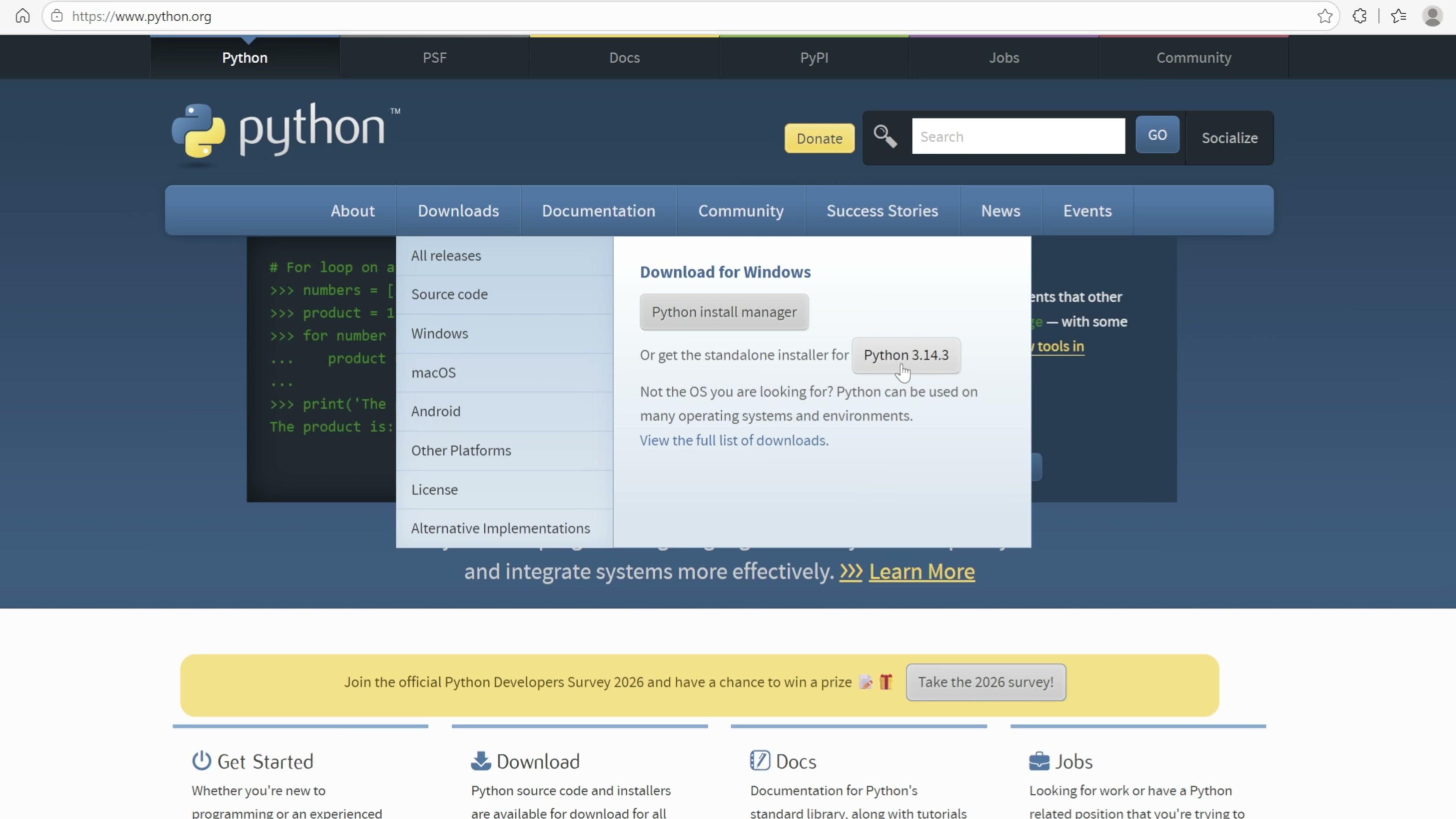 使用CLI Anything的前提是需要先在电脑上安装Python,我们可以来到Python的官网,在download这里下载安装最新版本的Python。