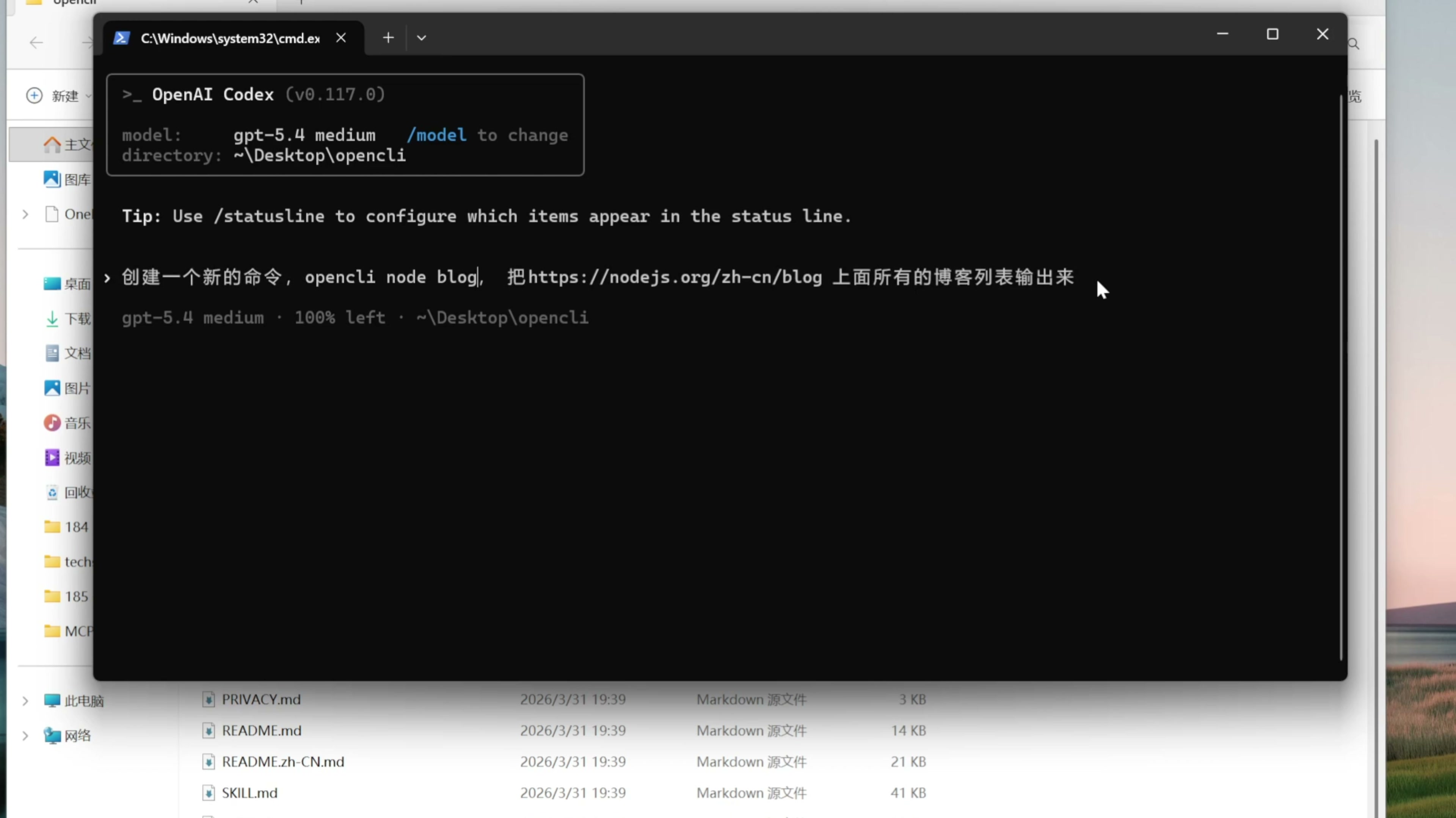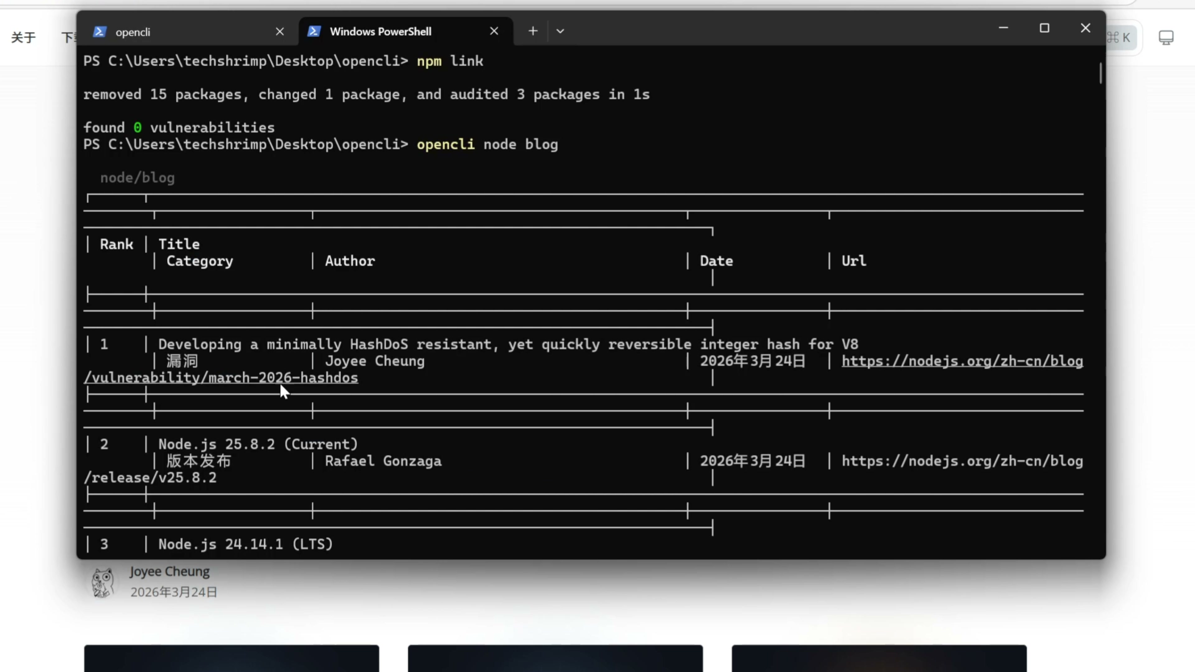 这样我们就可以直接使用新创建的命令行了。我输入 opencli node blog 就获取到了nodejs这个网站上面所有的博客信息。