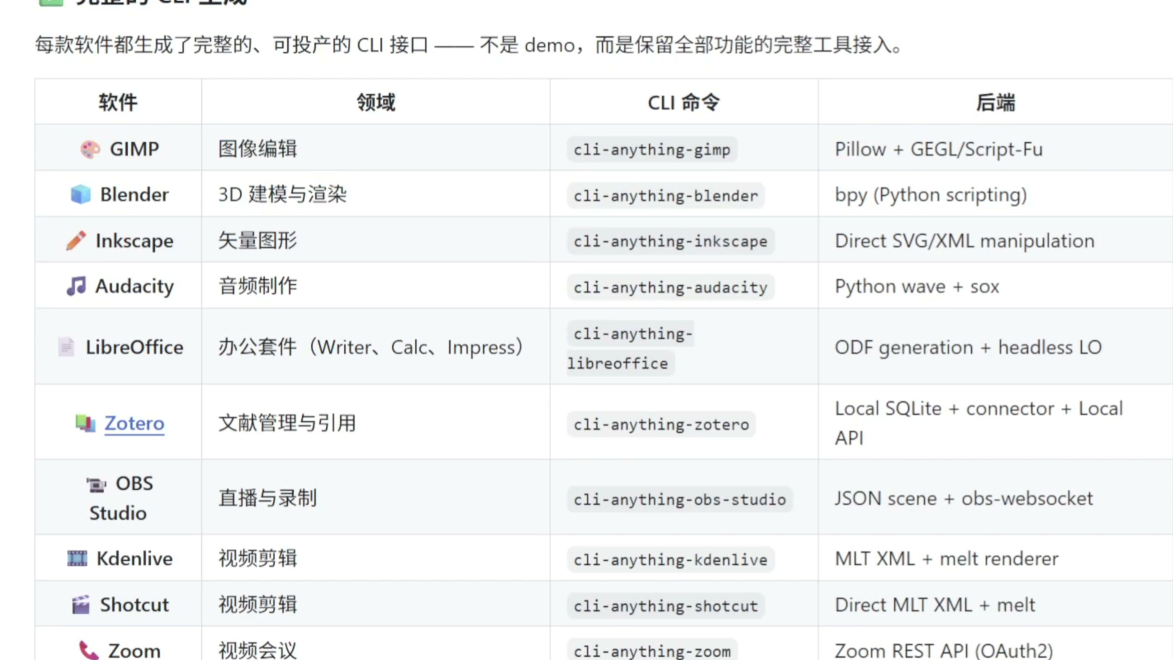 首先它分析软件源代码,分析出每个UI操作背后的API逻辑,然后规划CLI命令分组,设计输入输出,接下来进行编码实现,编写测试用例,更新文档并且发布。 我们看到开发者已经对以下11款软件进行了测试,都取得了不错的效果。