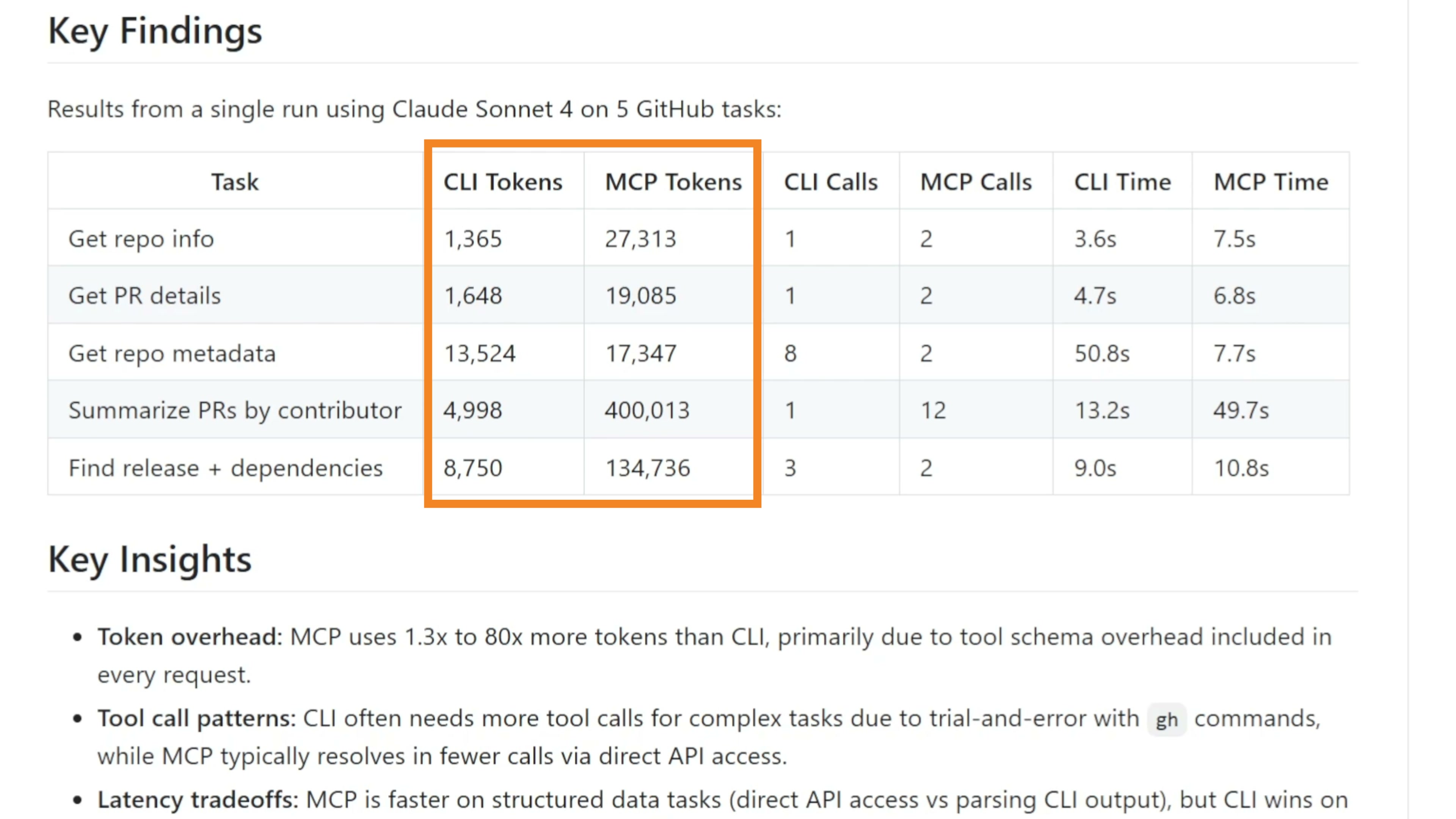 首先MCP上下文占用较高。MCP需要将所有的工具名字、参数格式还有调用示例全部注入上下文,每新增一个MCP工具都要占用大量的Token开销。而CLI则可以让AI自己学习用法,使用渐进式披露的方式来减少Token消耗。ScaleKit做过一组测试,使用GitHub的官方MCP与官方CLI进行对比,在所有任务上面,CLI的Token消耗都成倍的小于MCP。