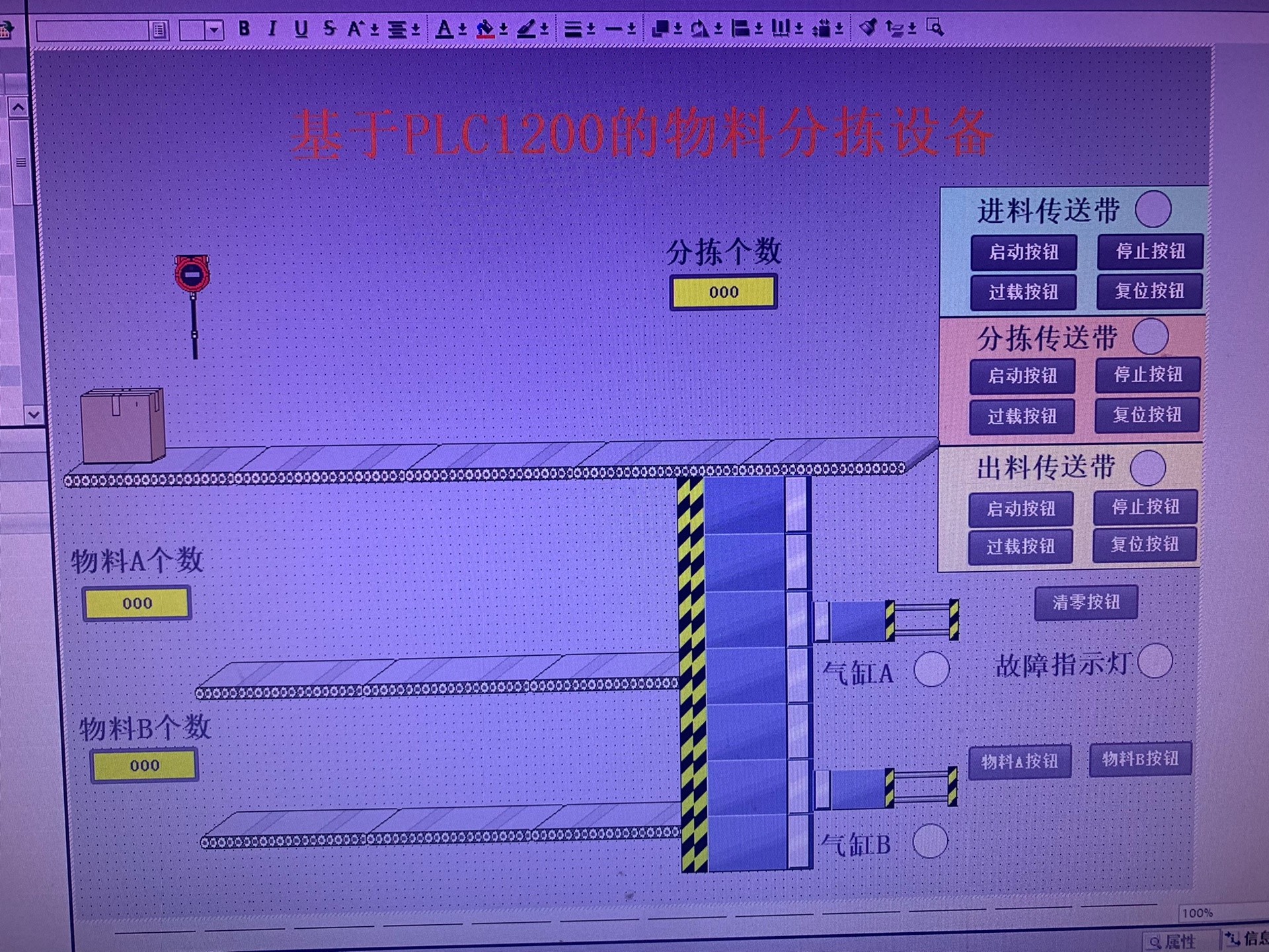 首先得说清楚这套系统的逻辑:流水线过来的水果,先被光电开关扫到,传送带暂停一下,称重传感器采重量数据,根据重量分三级——小果(<100g)、中果(100~200g)、大果(>200g),然后对应的推杆把水果推到专属料箱里,完事传送带继续走。