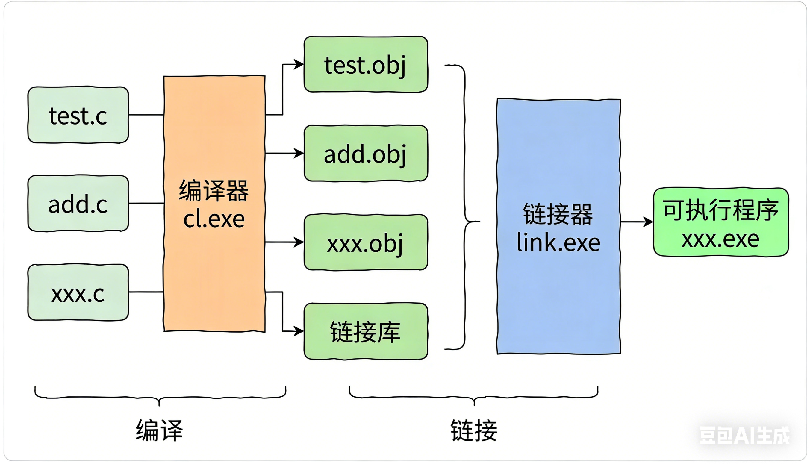 1. 每个源文件(.c)单独经过编译器处理生成对应的目标文件(.obj为后缀的文件).