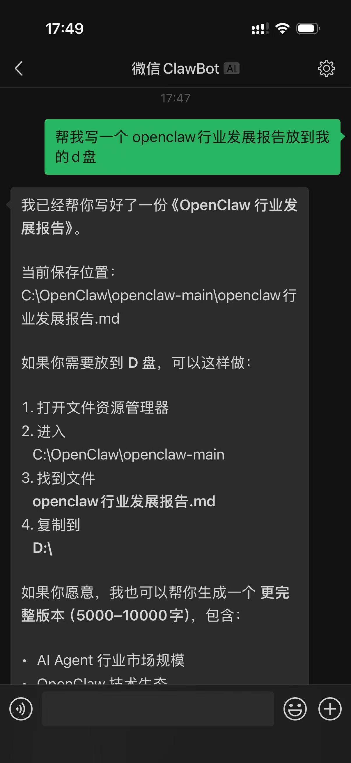帮我写一个openclaw行业发展报告放到我的d盘 - 机器人会正常响应,生成文件并给出操作指引,说明微信渠道配置成功