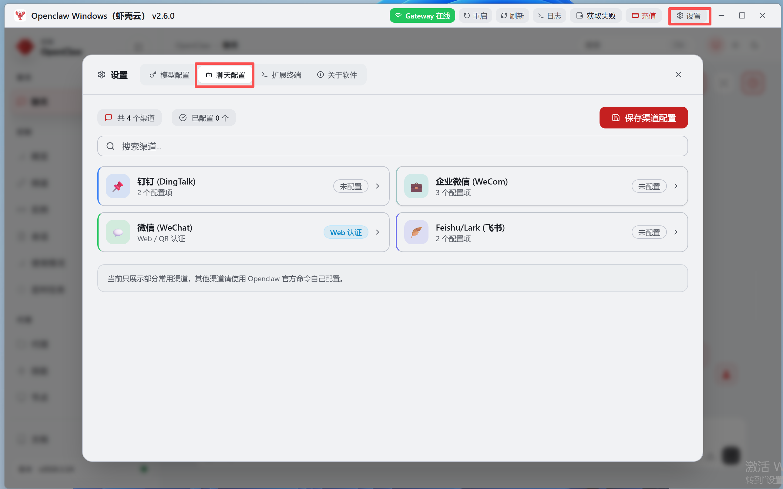 - 在设置面板中,切换到 **【聊天配置】** 标签页,即可看到支持的 4 个聊天渠道:钉钉、企业微信、微信、飞书