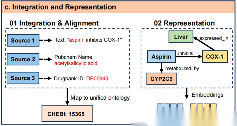 接着,整合与表示,负责数据清洗与转化,包含整合与对齐(解决多源数据名称不一致问题,如将Aspirin映射到统一ID)和表示(将知识转化为向量嵌入或图结构)两个子模块。