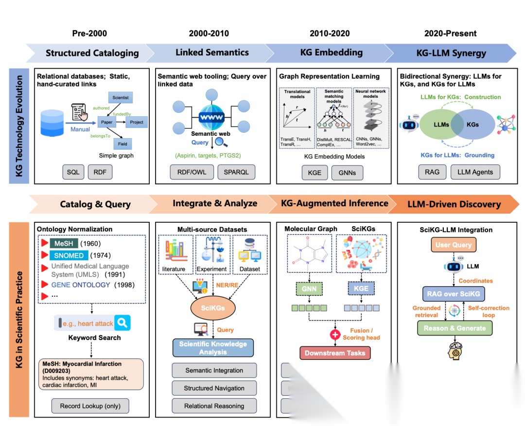 2000年以前(结构化编目阶段), KG技术主要依赖关系型数据库和静态的手动链接,侧重于数据的结构化存储与基础编目,科学实践上仅停留在简单的关键词检索和本体规范化(如MeSH);
