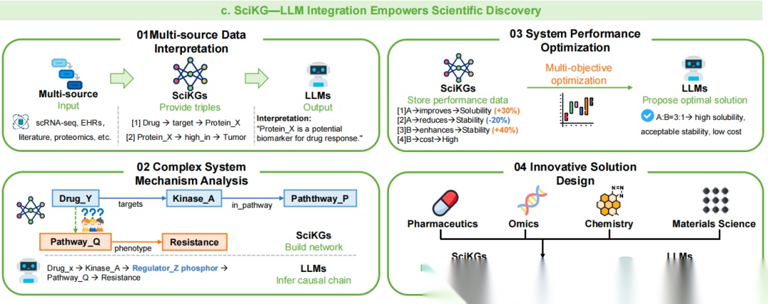多源数据解读,整合多源数据(如单细胞测序、文献、蛋白质组学),科学领域知识图谱提供三元组,大模型输出解读(如“蛋白X是药物响应的潜在生物标志物”);