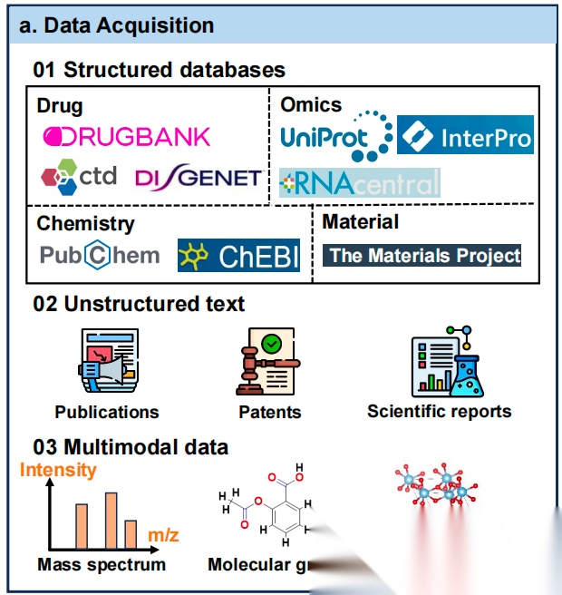 首先,数据获取:作为基石,整合了三类数据源,包括结构化数据库(如DrugBank、UniProt)、非结构化文本(如科学出版物、专利)以及多模态数据(如质谱图、分子结构)。