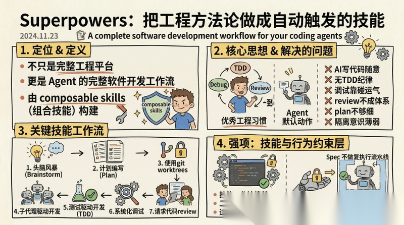 Superpowers 的定位也非常清楚,它不是把自己描述成“完整工程平台”,而是: