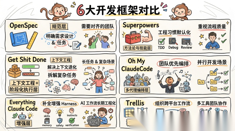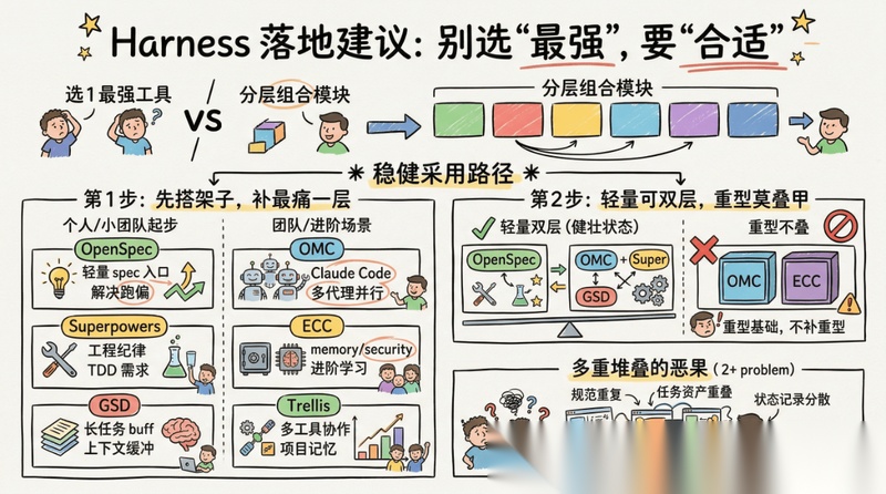 Harness 的定义相信大家也看得不少了,这里也就是稍微给一些还不清楚的朋友科普一下。今天我想讨论的,不是继续抽象地解释 Harness 是什么,而是更具体的问题:当市面上出现了 OpenSpec、GSD、OMC、ECC、Trellis、Superpowers 这些不同路线的工程化框架之后,我们到底该怎么理解它们、比较它们,并把它们搭成一套真正可用的体系?