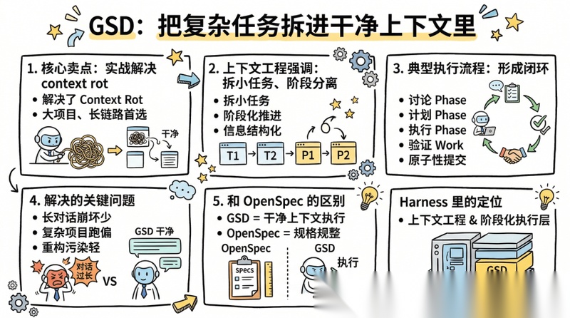 | Get Shit Done | 上下文工程 + 阶段化执行层 | 解决 context rot,把复杂任务拆成原子计划 | 长任务、复杂仓库、重构场景 |