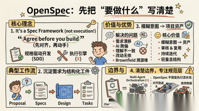 但也要说清楚边界:OpenSpec 不主打多代理编排,不主打上下文压缩,不主打复杂执行流水线。