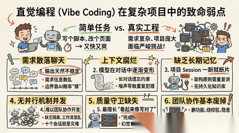 但一旦任务进入需求复杂、代码项目庞大、多人协作、分支并行、需要质量把关的真实工程。那么,Vibe Coding 这种方法,很快就会露出底牌: