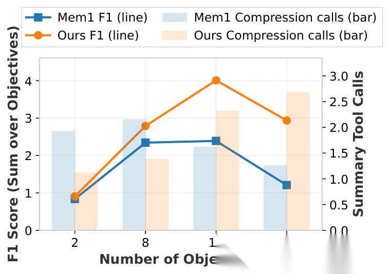 轻负载时(2/8 目标):方法在 F1 上比 MEM1 提升 8.3%/18.7%(0.84→0.91,2.35→2.79),同时压缩调用减少 41.7%/35.8%(1.92→1.12,2.15→1.38)。
