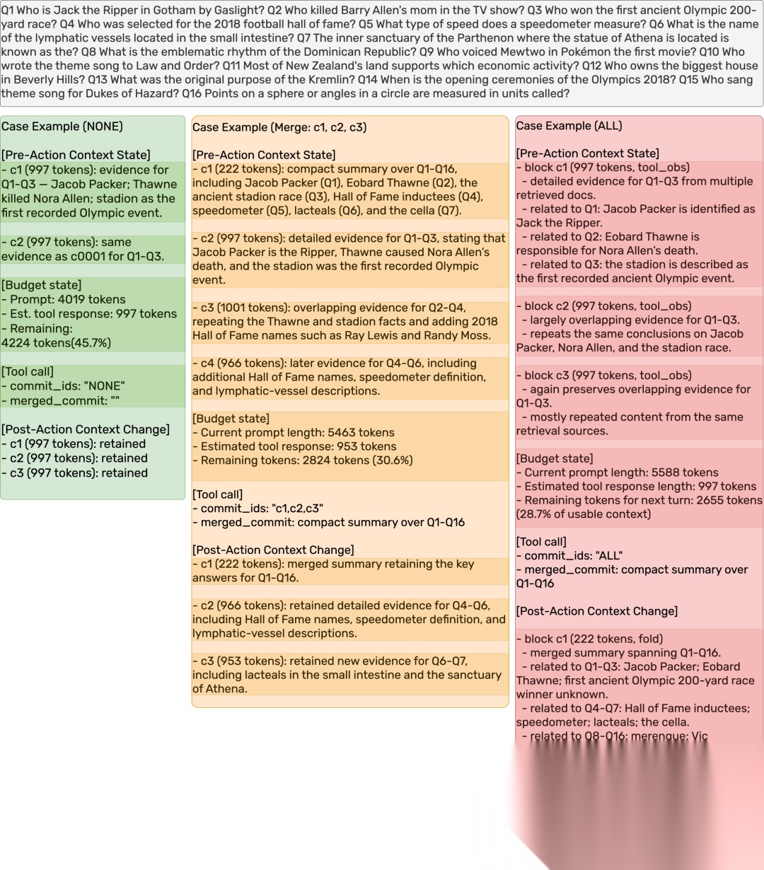 虽然 MEM1 和 Summary 等无预算策略部分缓解了性能下降,但仍然较差。MEM1 由于逐轮过度压缩导致信息丢失,而 Summary 由于延迟压缩导致推理失败。相比之下,将上下文管理形式化为预算感知序列决策问题,使得能够自适应地调节提交块聚合强度。