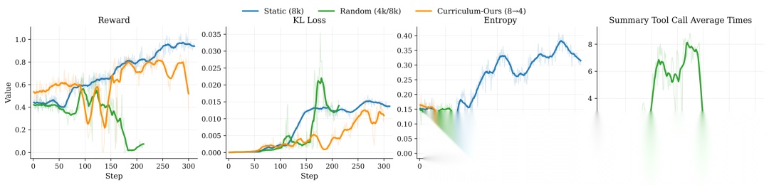 Qwen2.5-7B-Instruct 在不同课程策略下的训练动态:奖励、KL 损失、熵和摘要工具调用平均次数。渐进式课程(Curriculum-Ours)展现出更稳定的训练过程和更高的最终奖励。