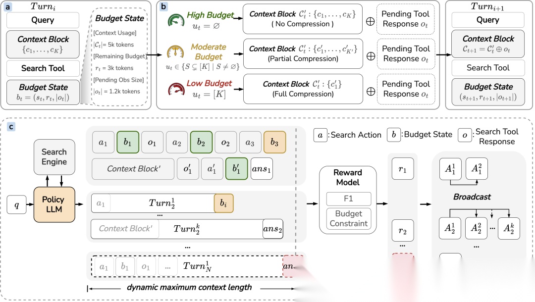 预算感知上下文管理框架的整体流水线。智能体首先观察预算条件状态,然后执行精炼动作进行上下文更新,最后通过多轮 GRPO 训练优化策略。