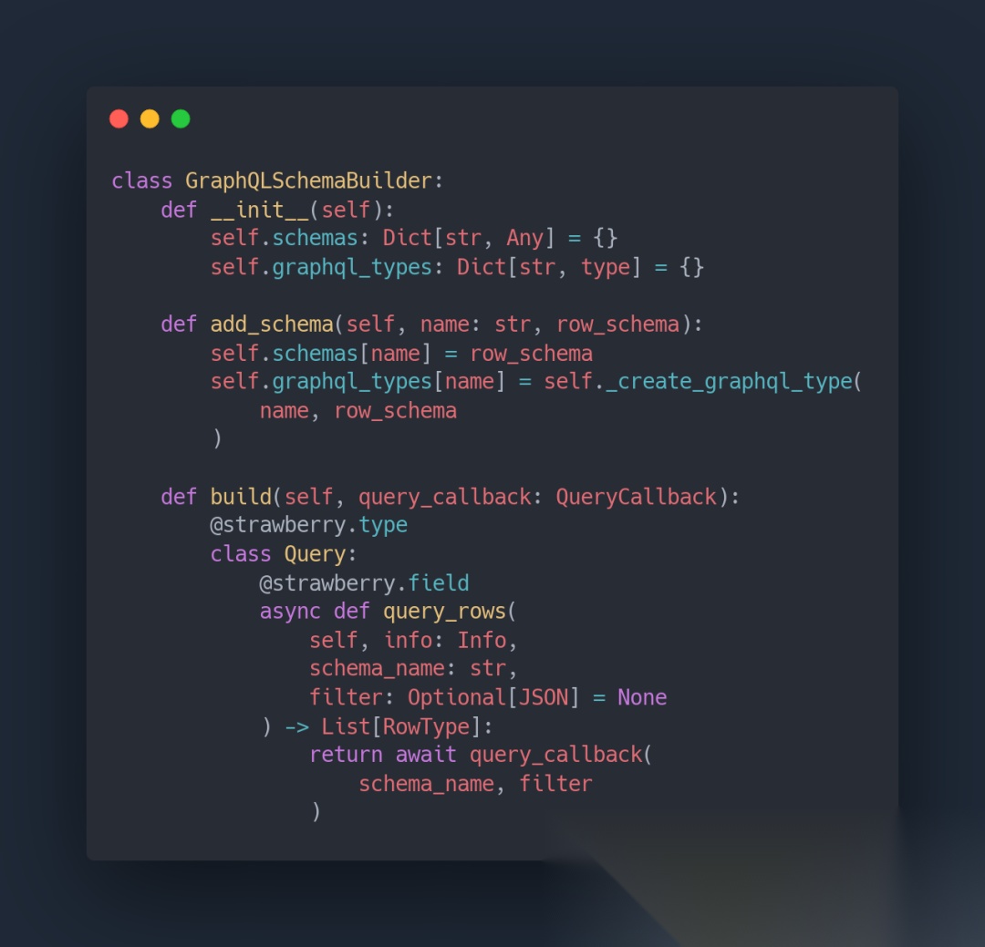GraphQLSchemaBuilder类可以从RowSchema定义动态生成Strawberry GraphQL Schema。这意味着你的数据模型变化时,API会自动适配,无需手动维护接口文档。