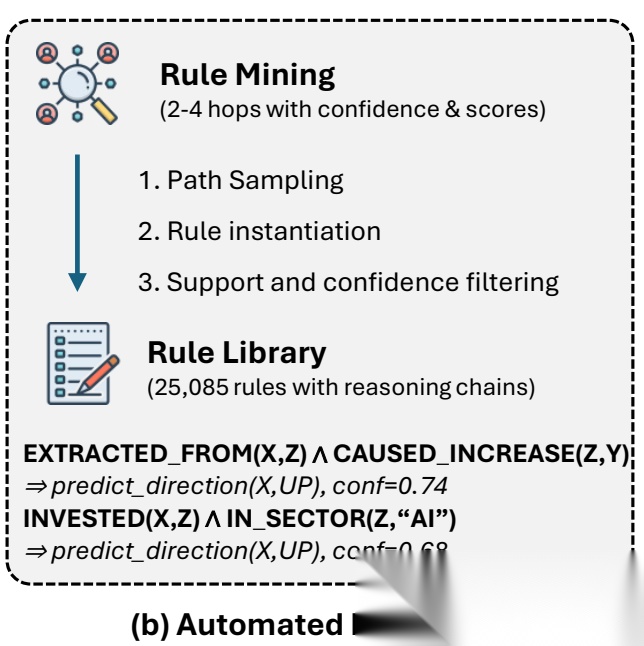 金融时序知识图谱中自动挖掘出有预测力、高置信度的关系模式,用来约束后续图搜索,让推理只走“金融上有意义”的路径,而不是随机游走。这个就很像抽象的推理模式【我们一直说的事理图谱】