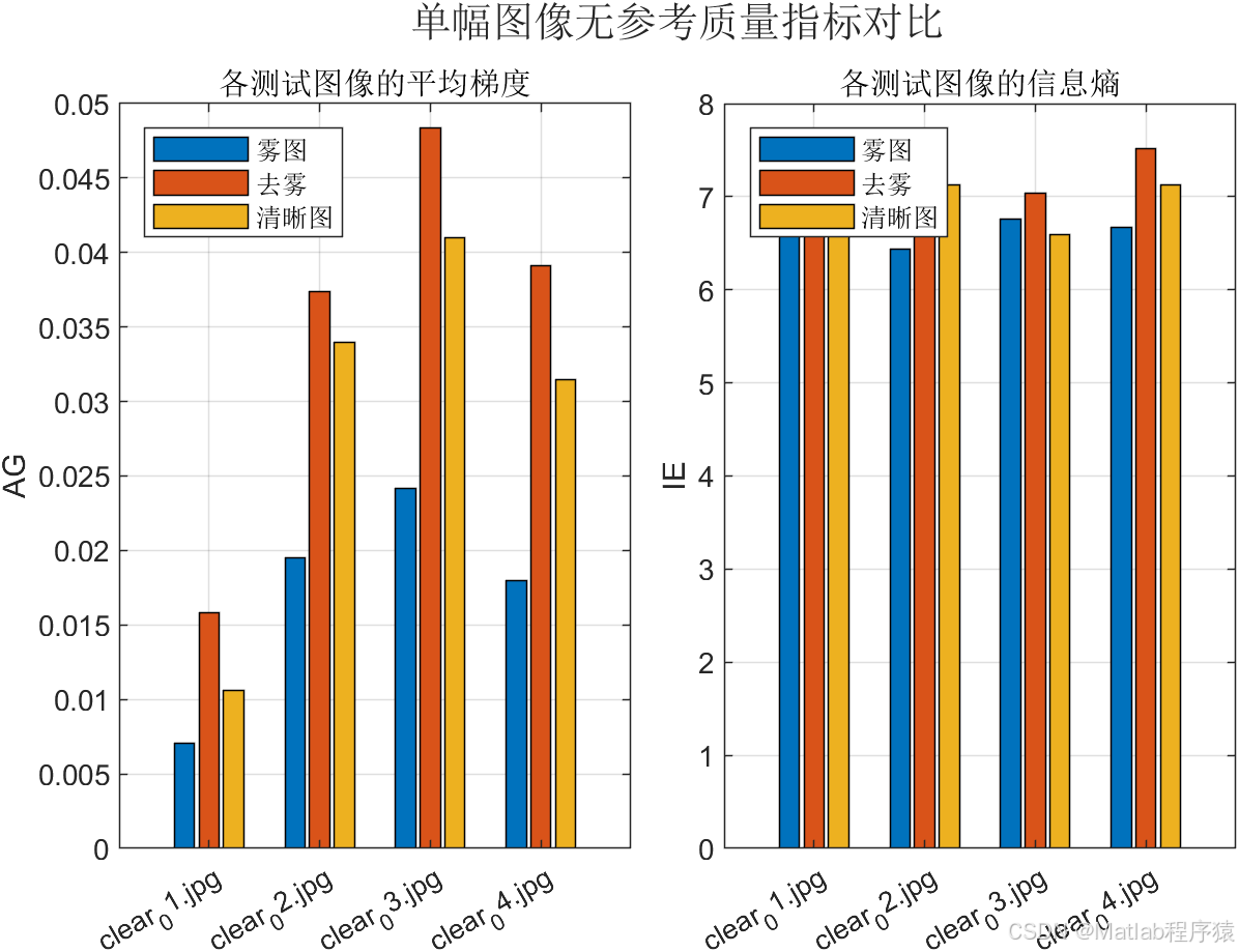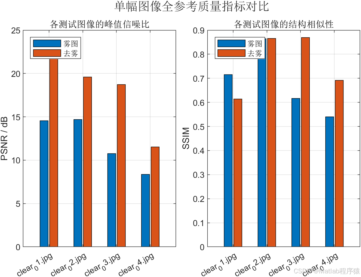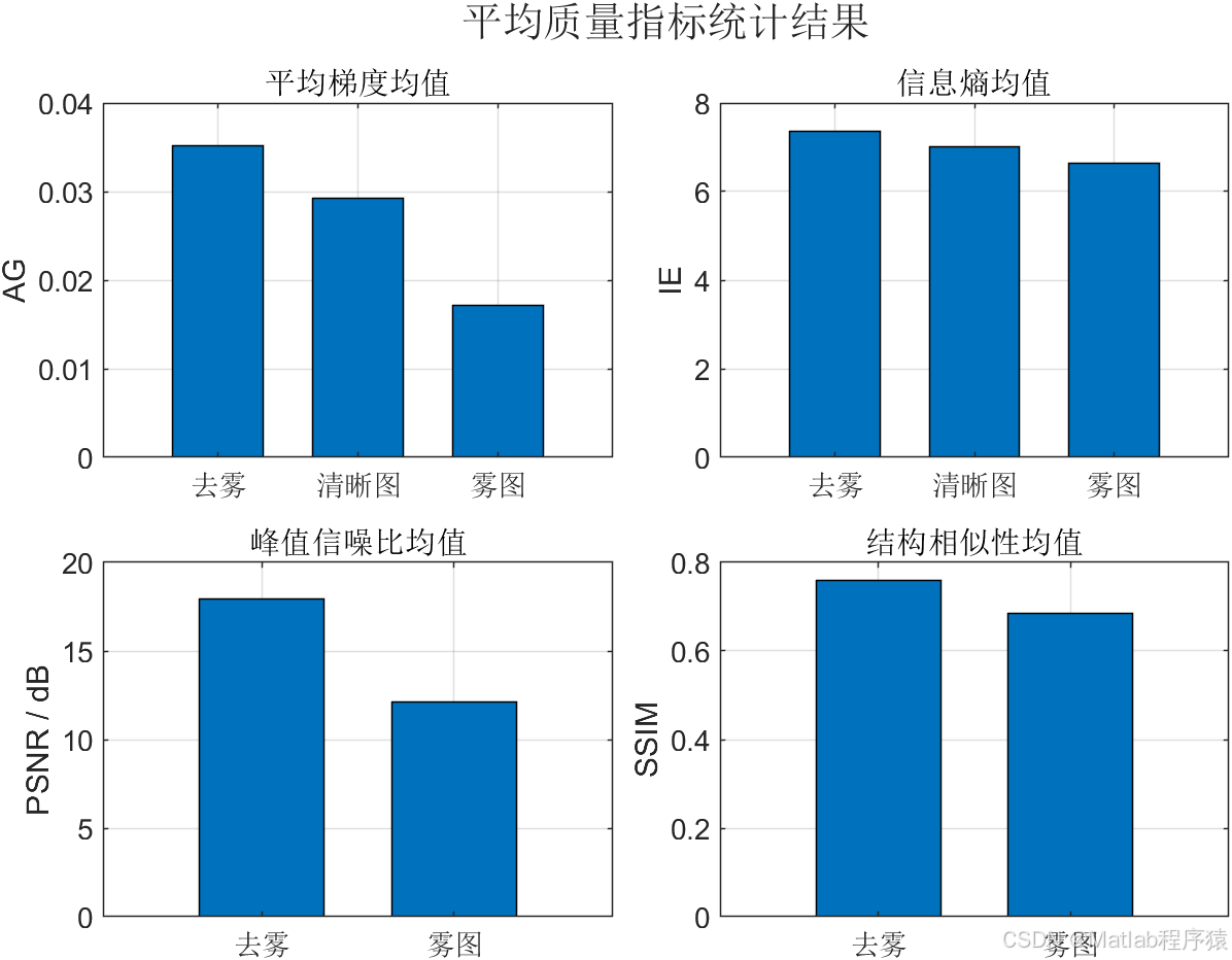 在质量评价方面,系统对合成雾图去雾结果采用全参考指标与无参考指标相结合的方式进行分析。全参考部分主要采用峰值信噪比和结构相似性,用于衡量恢复图像与清晰参考图像之间的保真程度;无参考部分选取平均梯度和信息熵,用于描述图像边缘清晰度和信息丰富程度。已有综述研究明确指出,PSNR 和 SSIM 是当前图像去雾研究中最常用的全参考评价指标,在公开挑战赛中也被持续采用。
