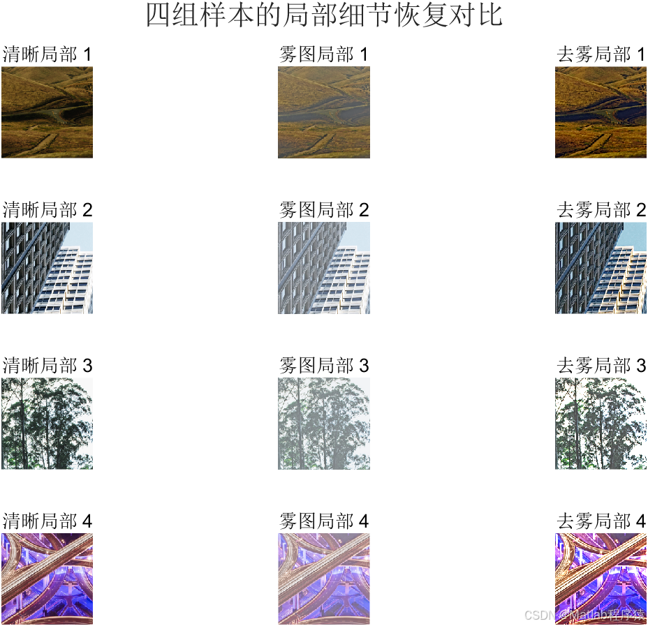 此外,系统还输出典型样本的整体对比图、局部细节对比图、中间量可视化图以及真实雾天恢复展示图,以便从视觉层面对算法性能进行直观分析。这样的设计不仅能够反映数值指标的变化,也有助于判断图像是否存在伪边缘、颜色漂移、亮度失衡等主观质量问题。