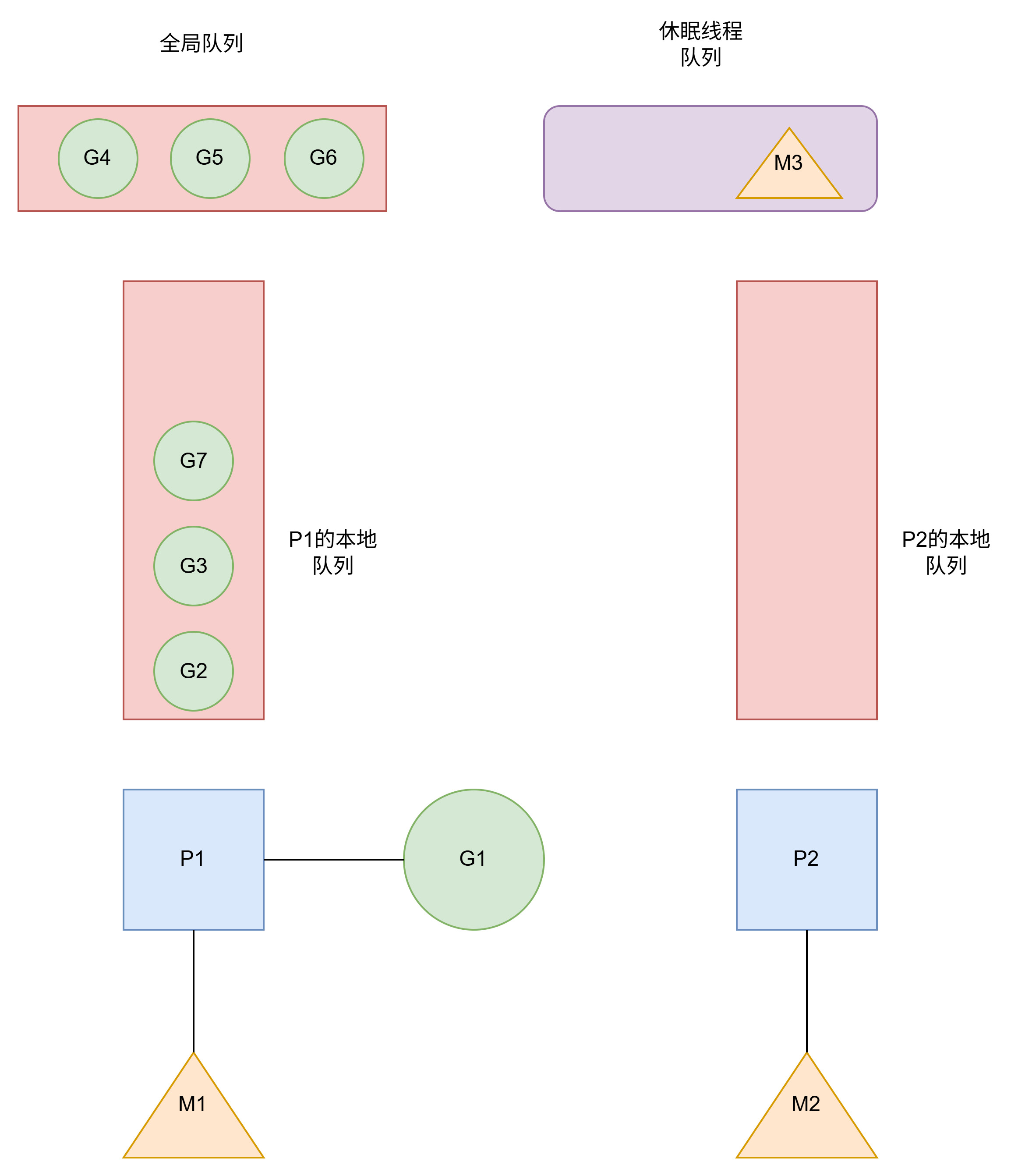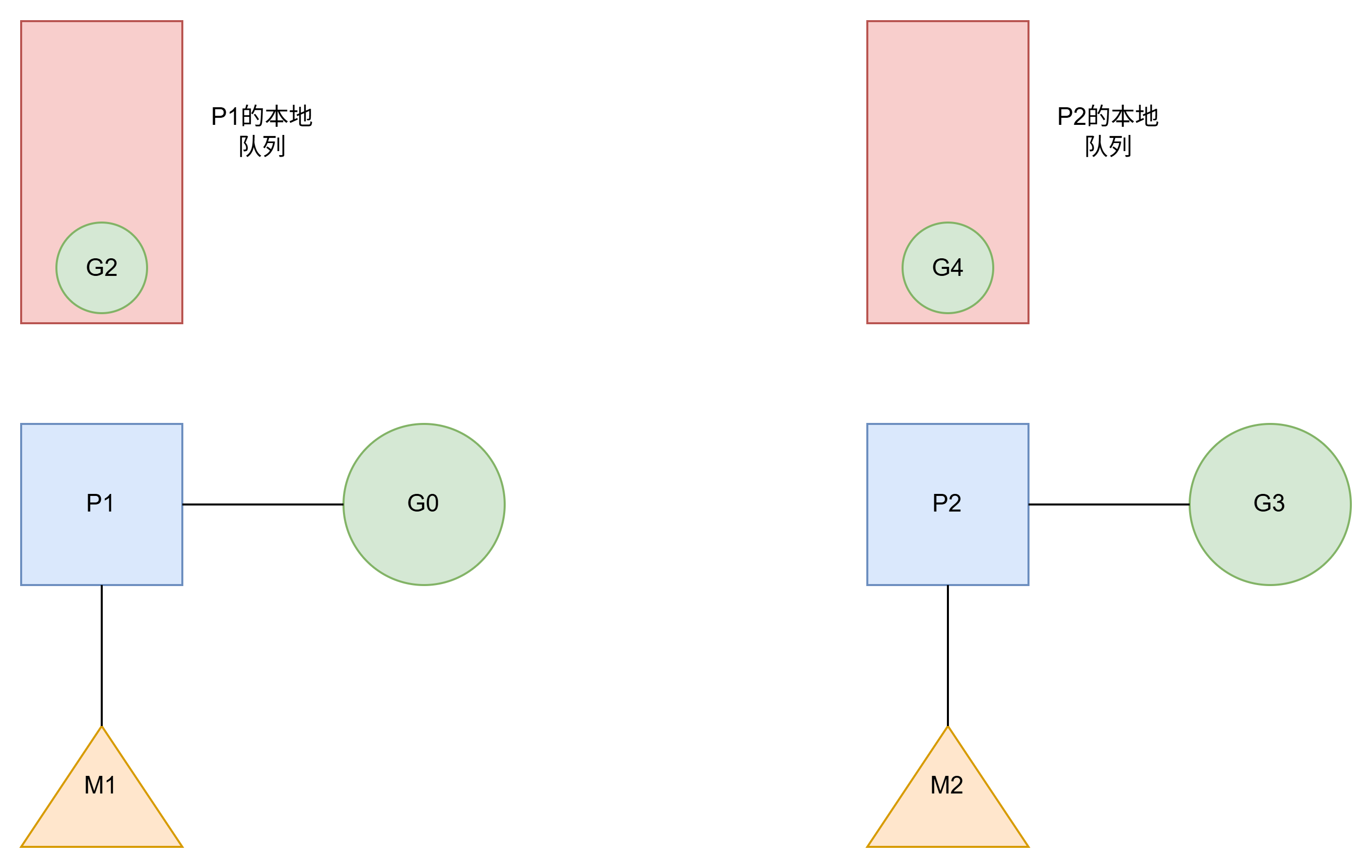 体现了GPM调度的局限性.P1拥有G1.M1获取P1后开始运行G1. P2拥有G2.M2获取P2后开始运行G2如下图.