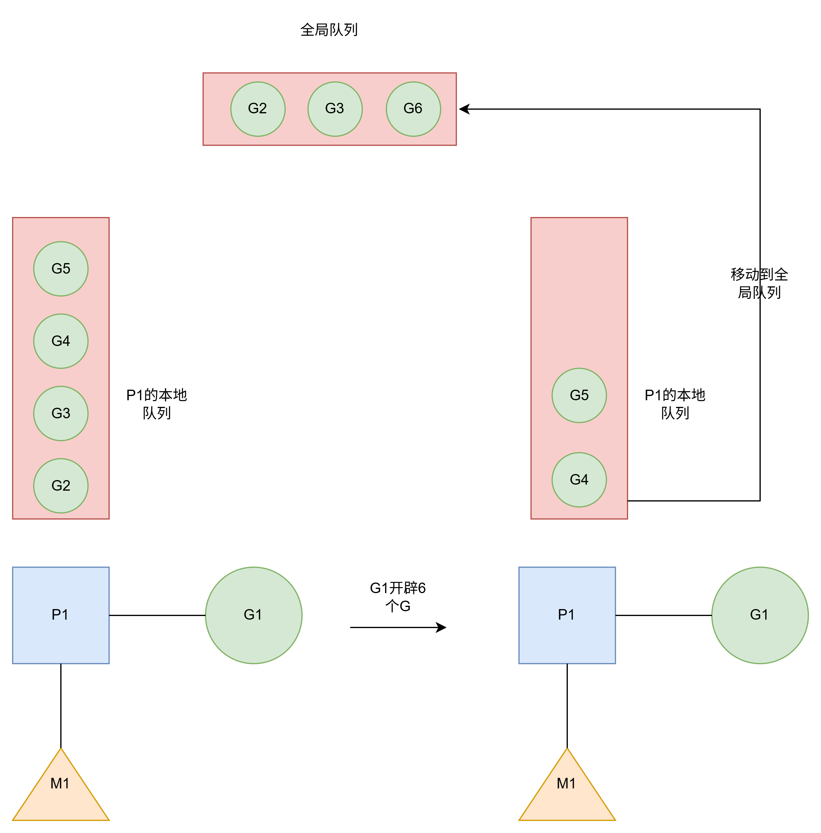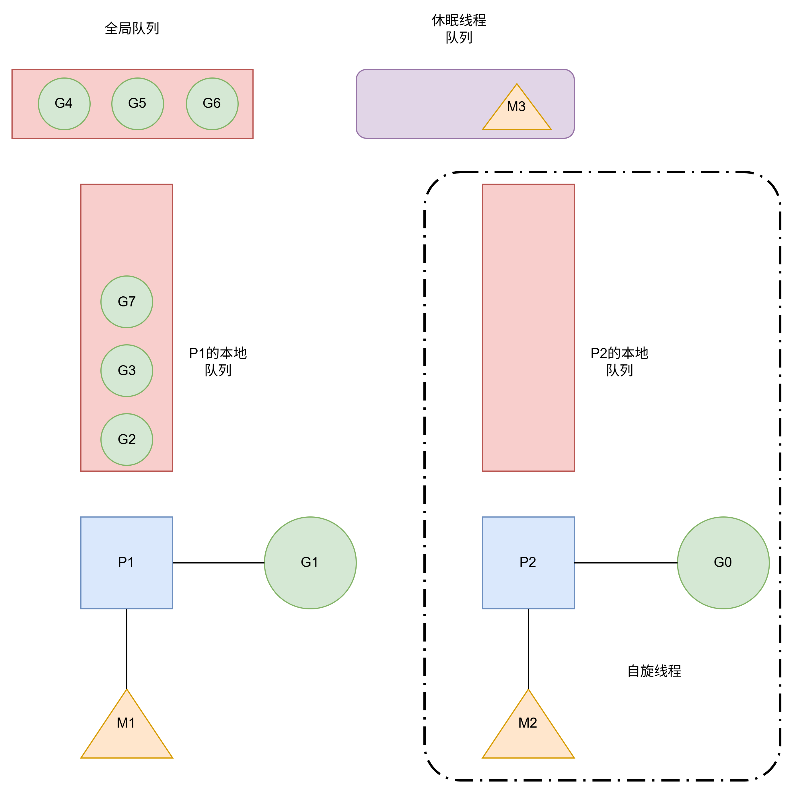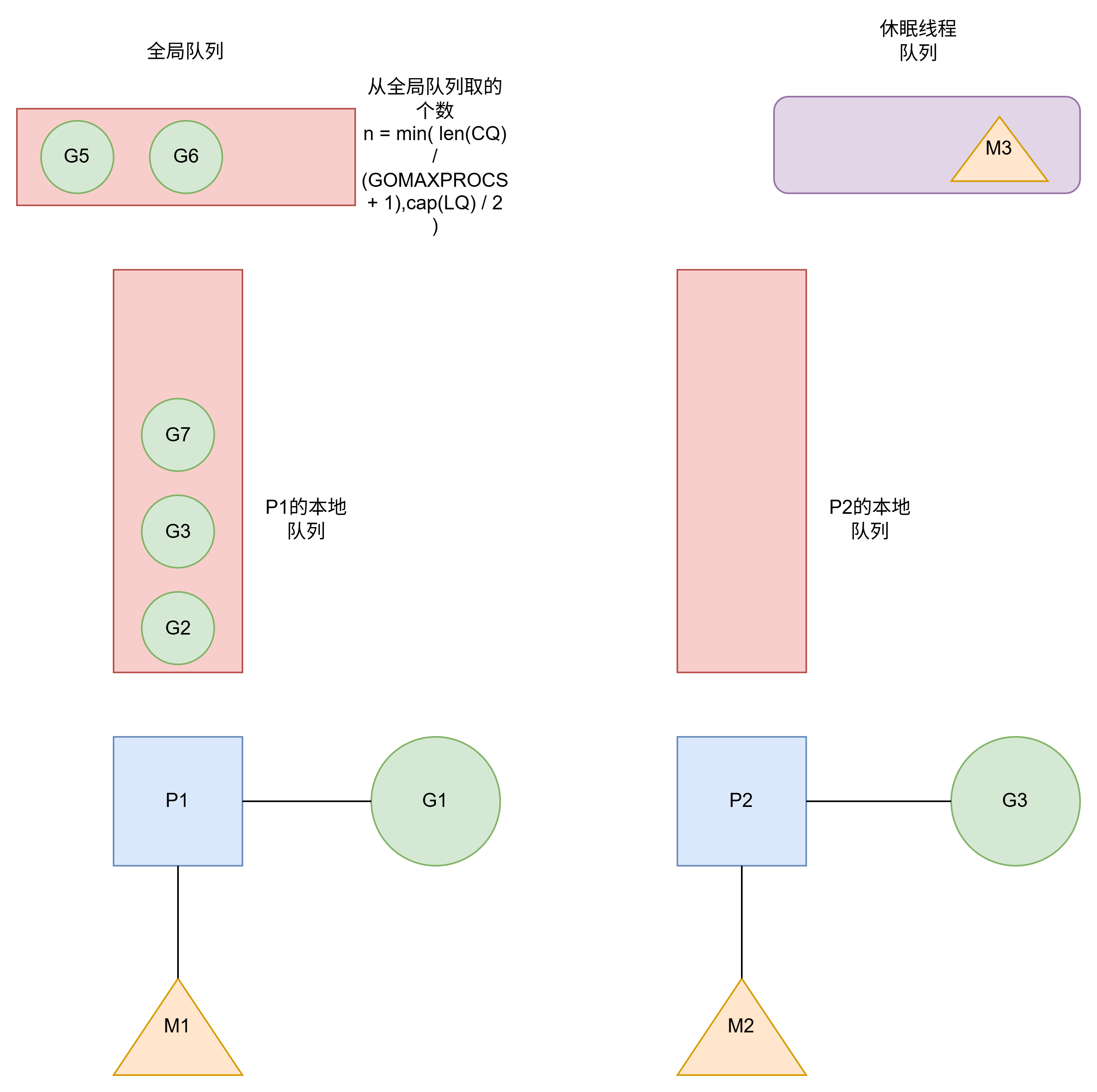 P2本地队列有G8.可以和其他空闲线程M5绑定.如图所示.