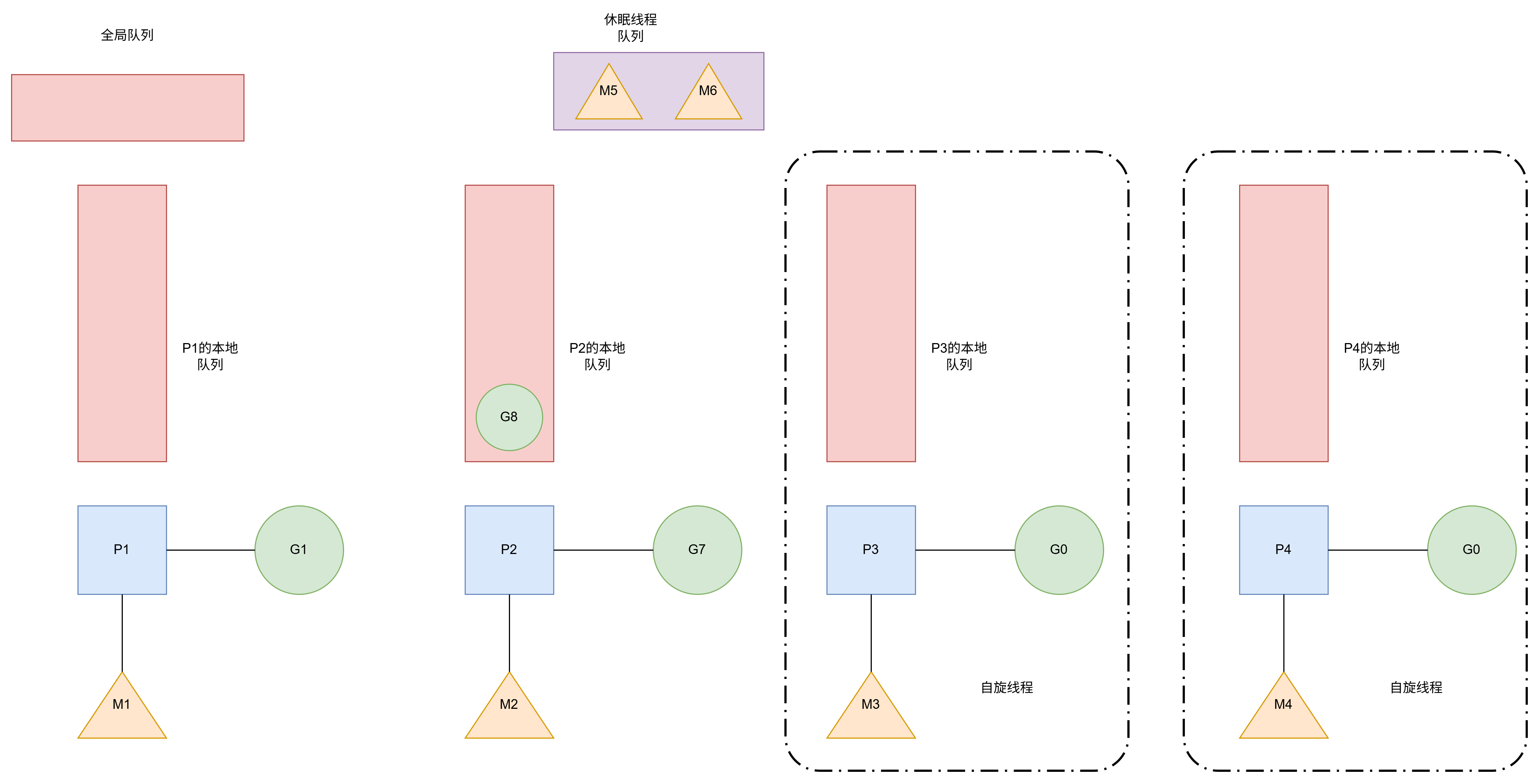 当前M1和G1绑定.并且P1本地队列中有G2.M2和G3绑定.并且本地P2队列中有G4.如图所示.