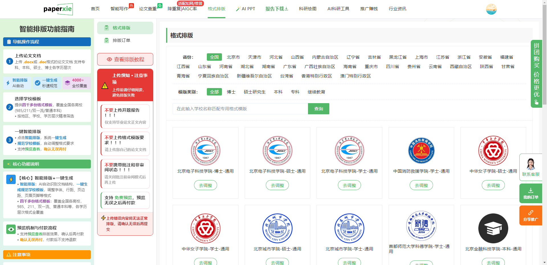 - 搜索筛选:直达目标:设置「学校名称搜索框」,输入全称(如「首都师范大学科德学院」)点击查询,就能直接跳出对应学校的专属模板卡片。卡片上标注「学校名称 + 学历层次 + 通用版」,搭配校徽标识,和图片里展示的模板样式完全一致,点击「去调整」就能锁定规范。