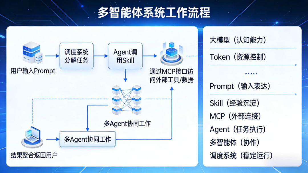 在这一过程中,大模型提供认知能力,Token控制资源使用,Prompt负责输入表达,Skill承载经验沉淀,MCP打通外部连接,Agent执行具体任务,多智能体实现协作,而调度系统则保证整体运行的稳定性。