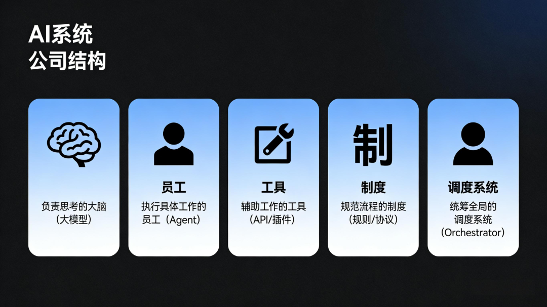为了让这件事情变得更容易理解,我们可以借助一个简单但有效的类比:将整个 AI 系统想象成一家公司。在这家公司中,有负责思考的老板,有执行具体工作的员工,有辅助工作的工具,有规范流程的制度,还有统筹全局的调度系统。不同的 AI 概念,恰好对应着这些不同的角色。一旦建立起这样的整体视角,原本分散的术语就会自然归位。