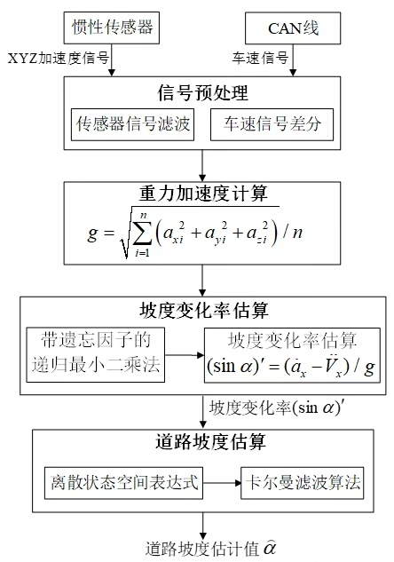 1,扩展卡尔曼滤波。 道路坡度估计算法,使用Simulink模型搭建,已经在实际道路上测试使用。 主要程序执行流程: 1) 获取陀螺仪和加速度采集的实时动态信息 2) 初始化用来校正传感器 3) 通过预处理对信号进行滤波,消除大部分错误和失真的信号 4) 主处理动态调整加权因数、利用角速度校正加速度等方法,得到最优的 坡度估计 5) 通过 CAN 总线将估计的坡度信号传递给整车其他电控单元 该道路坡度估计方法融合传感器和车速信号的和系统,包括以下步骤:一、信号预处理,包括对惯性传感器获得的原始加速度信号的低通滤波和从CAN线获得的车速信号的差分;二、计算重力加速度,利用惯性传感器预处理后的XYZ加速度信号计算当地重力加速度;三、利用带遗忘因子的递归最小二乘法估算道路坡度变化率,滤除大量噪声并且保证算法的实时性;四、利用卡尔曼滤波算法估算道路坡度,将传感器信号和车速信号进行数据融合,提高道路坡度估算的精度。