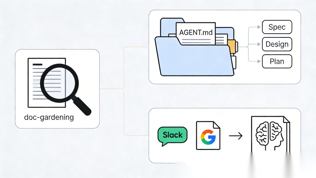 很多关键信息不在代码库里——可能在 Google Doc、Slack 讨论、甚至人的脑子里。需要把这些信息转化为 repo 中的 Markdown 文件,让 Agent 能访问。可以把 Agent 想象成一个刚入职的同事:你不能指望它猜出之前 Slack 里达成的某个技术共识,必须把信息沉淀成文档。
