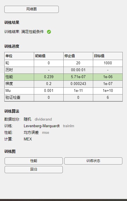 size(t_train,1)自动计算)。 - 训练参数设置:默认训练次数1000次、目标误差1e-6、学习率1e-4,支持关闭训练可视化窗口(