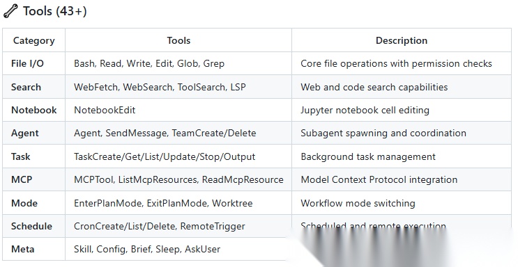 作者团队给出的工具数超过 43 个,涵盖文件 I/O、搜索、Notebook 编辑、子智能体协同、任务管理、MCP 接入、模式切换、定时调度以及系统元操作等多个方向。这些工具意味着 OpenHarness 不只是“会调用 bash”,而是已经具备了一套比较完整的 agent 行为原语。