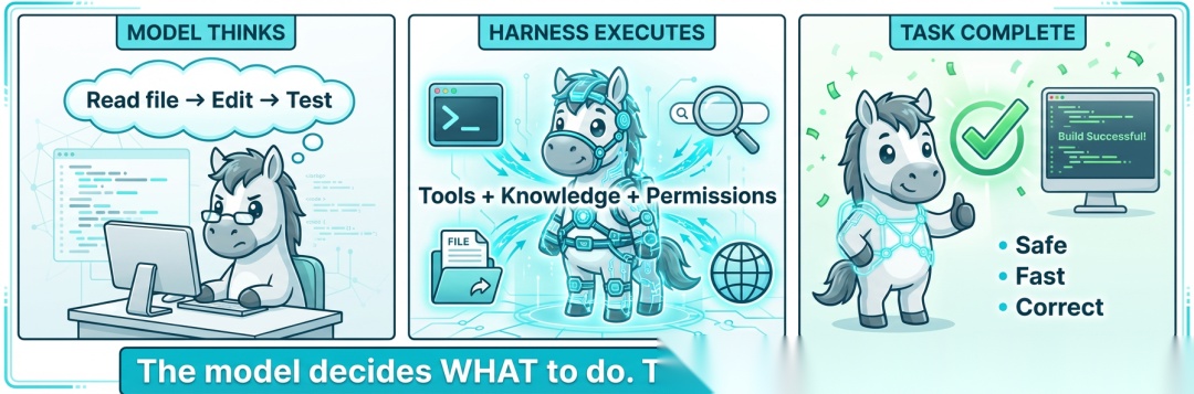 模型负责决定做什么,Harness 负责决定如何安全、稳定、高效地完成。