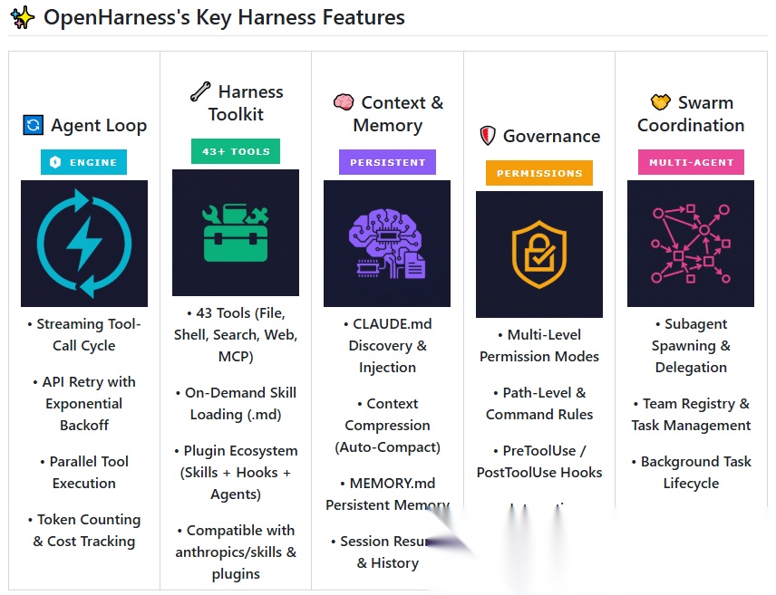 也正因为如此,OpenHarness 的关注点从一开始就不只是“模型输出内容”,而是进一步推进到 工具链路、反馈回路、权限治理和多轮执行结构。