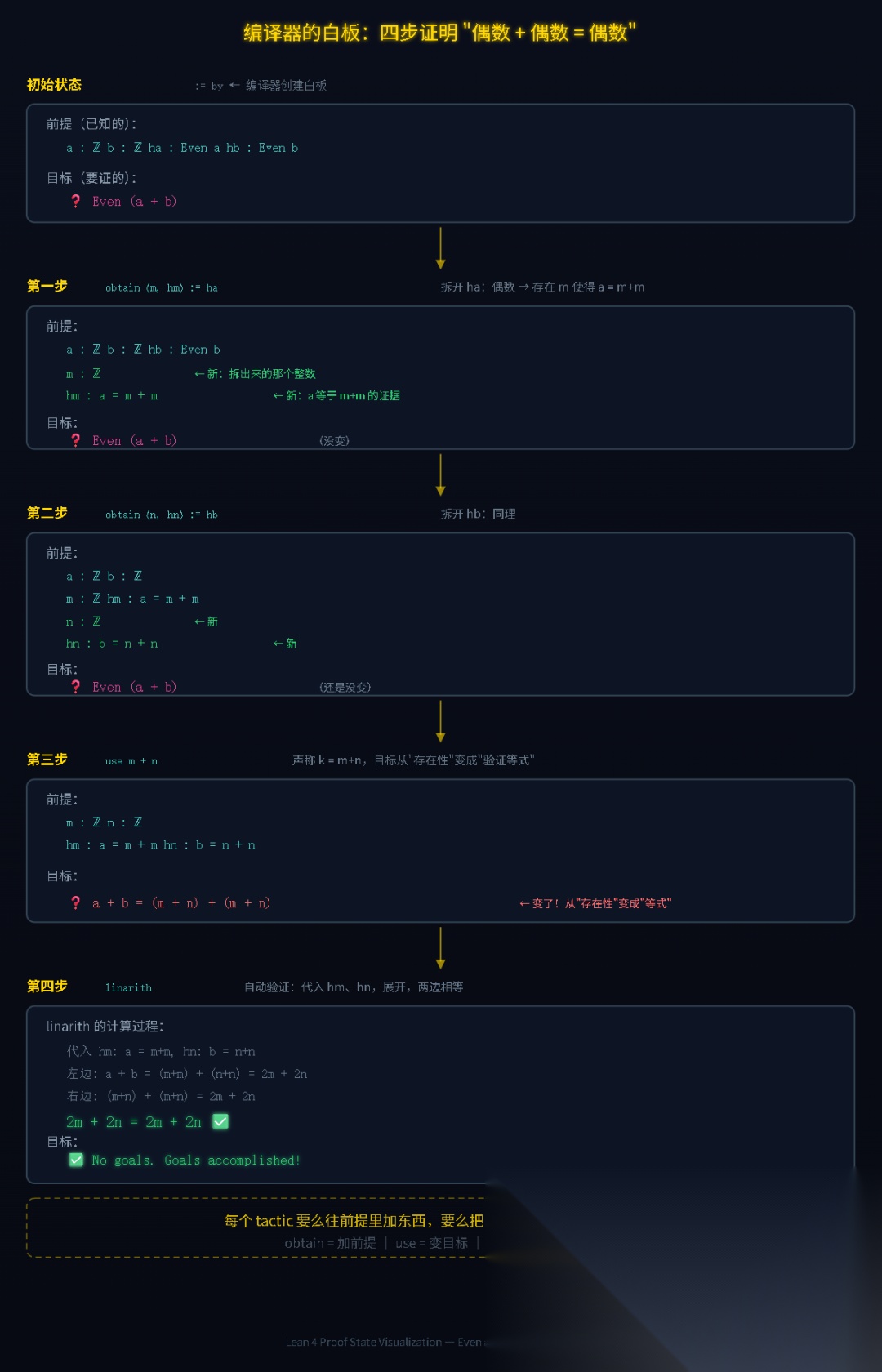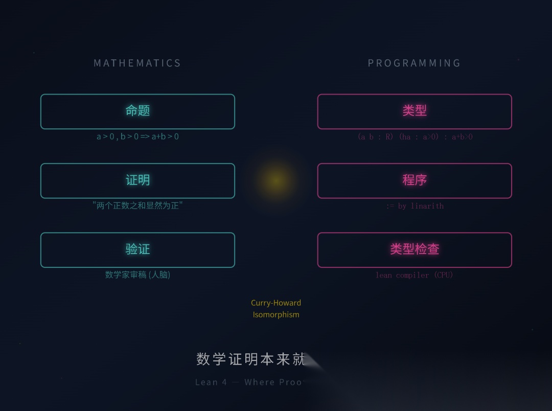 Lean 做的事就是逼你把每一步都写清楚。一旦写清楚了,它就变成了代码——有输入、有输出、有类型检查、能编译。