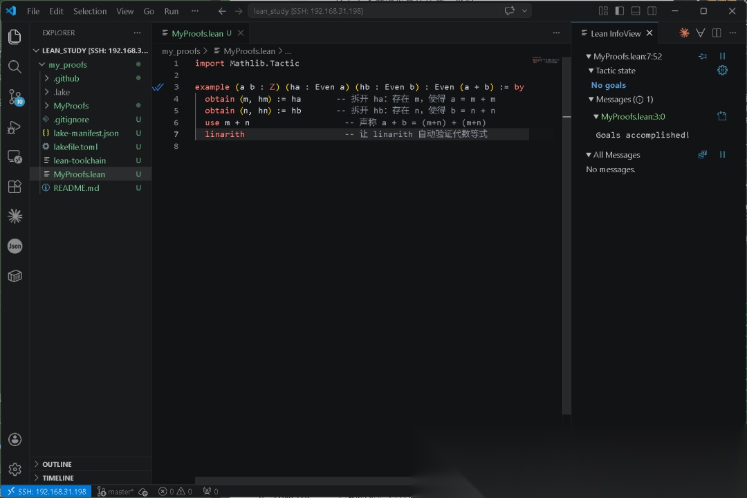 你在 VS Code 里装上 Lean 插件,保存这段代码,如果左边没有红色波浪线——编译通过了,证明成立。如果你把 hb : b > 0 改成 hb : b > -1,linarith 就会报错:它没办法从 a > 0 和 b > -1 推出 a + b > 0,因为这在数学上确实推不出来(a = 0.5, b = -0.6 就是反例)。