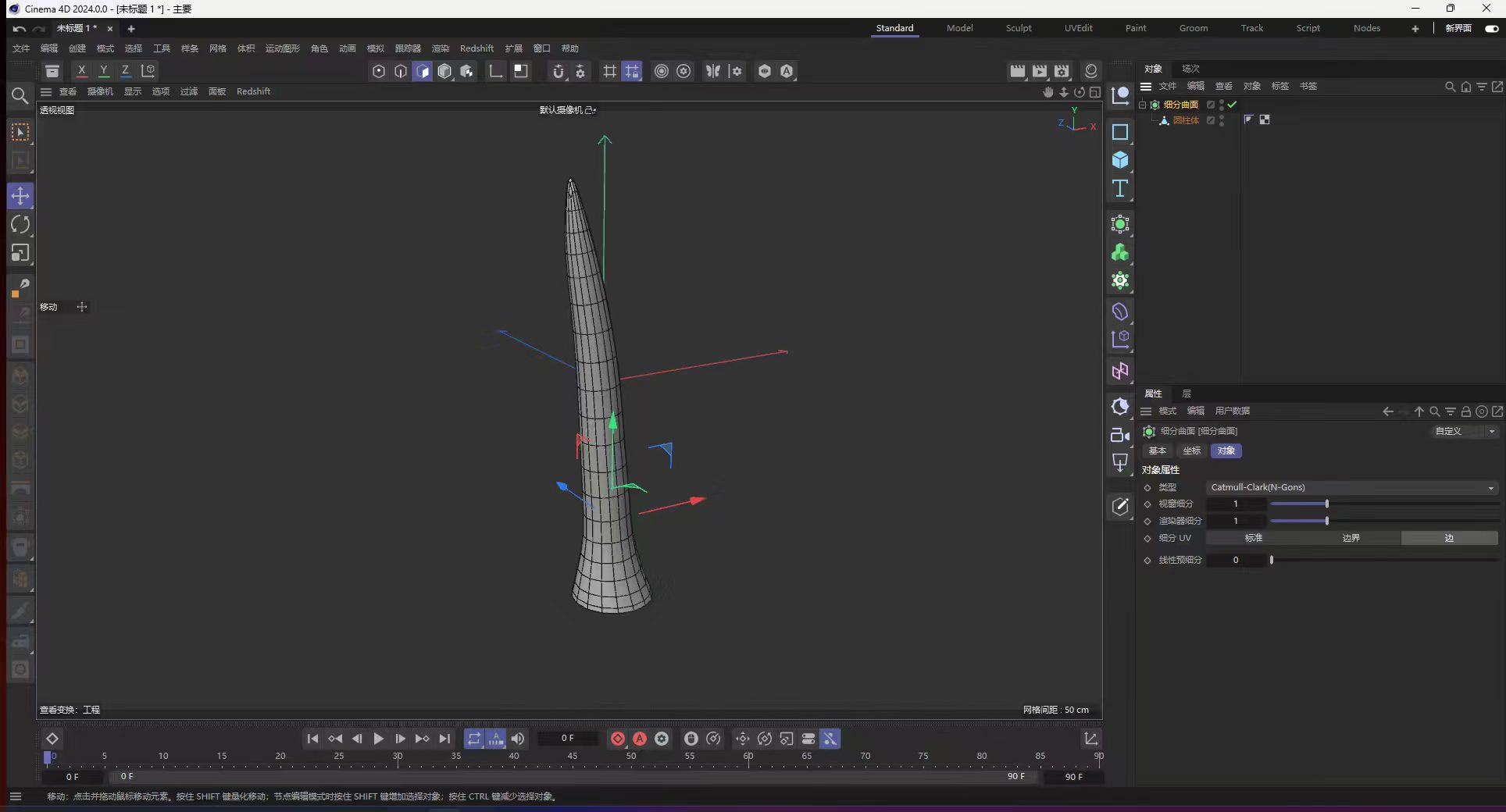 在菜单选择:创建 → 细分曲面,把之前做好的锥形模型拖到细分曲面下方作为子对象。在右侧属性面板调整细分精度:控制编辑器里显示的平滑程度和最终出图的精细度。将原本有明显棱角、边缘生硬的模型,经过细分后表面变得平滑、柔和,整体看起来更圆润饱满,更接近火焰/火源的流畅外形。