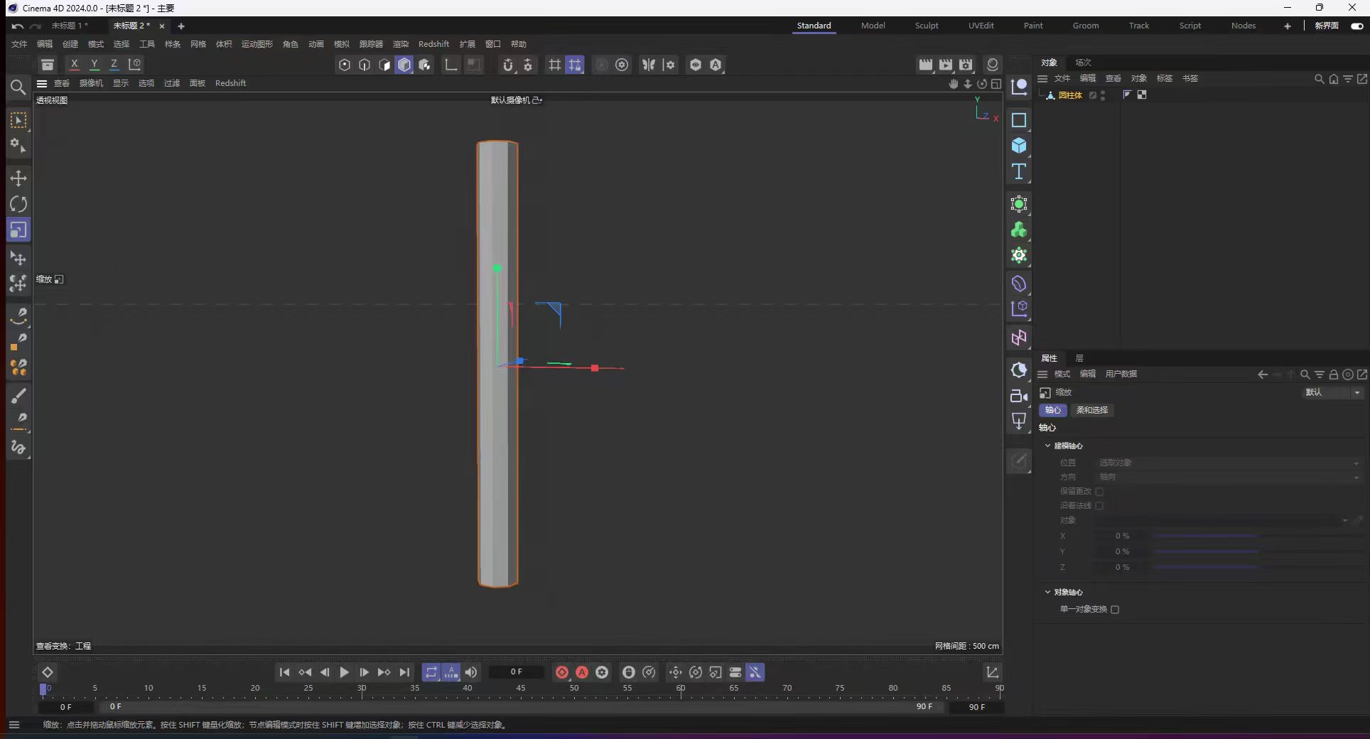 选中场景里的圆柱体,确保它处于激活状态。点击左侧工具栏的缩放工具,或按快捷键 T,视图中会出现红绿蓝三色缩放控制器。拖动绿色箭头(Y轴),将圆柱体向上拉长,让原本矮胖的圆柱变成细长的柱状,比例更接近火源、火焰的基础形态。